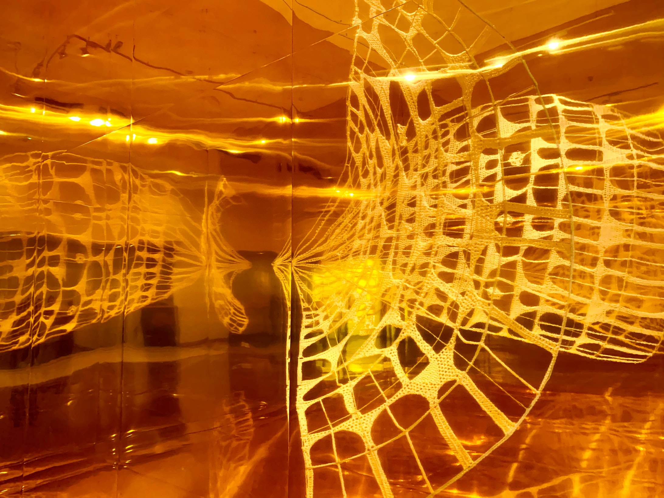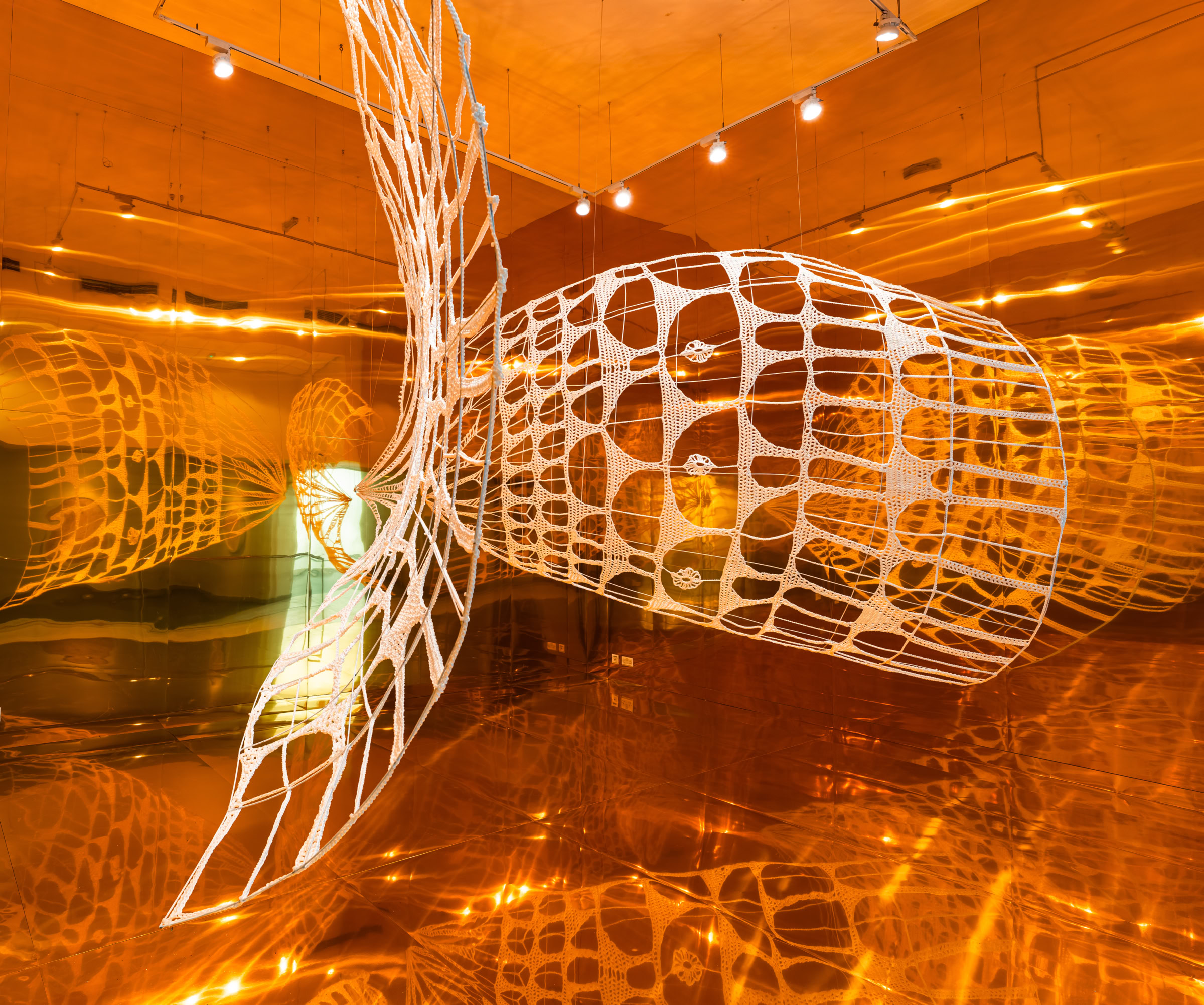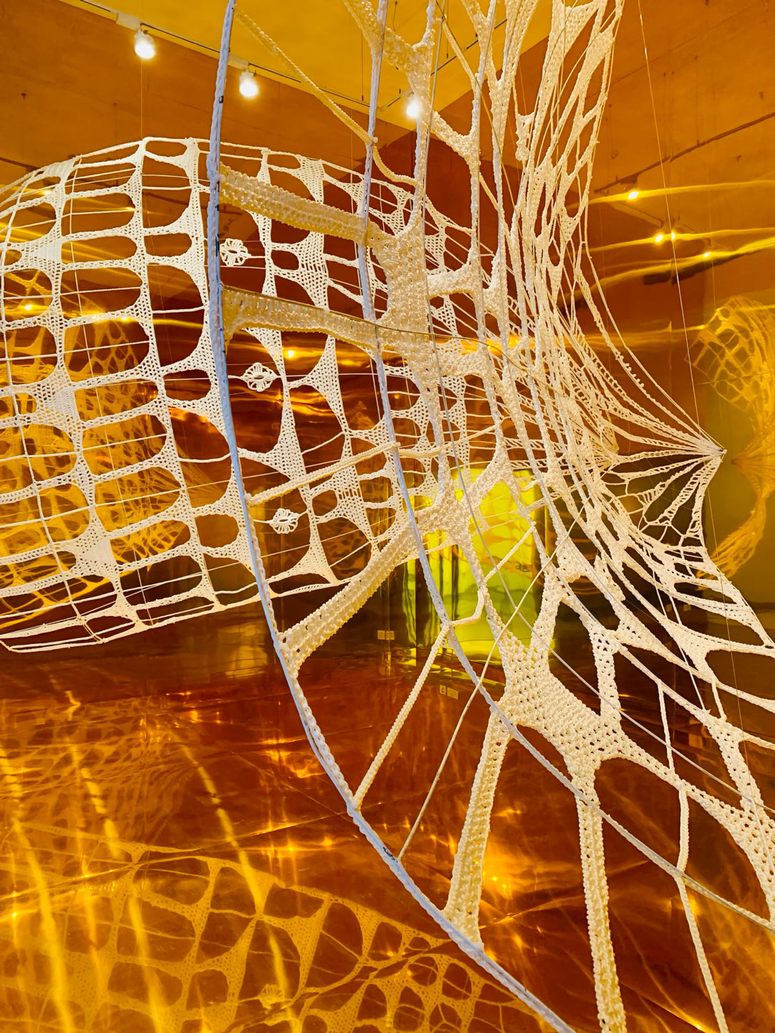 The work elevates everyday craft and familiar objects that are close to our body. The pattern of the work is based on the geometry of Muqarnas, in its order of fundamental indivisible elements and their relations while the hand crocheted membrane relates to the Kufi hat that are common in Muslim world.