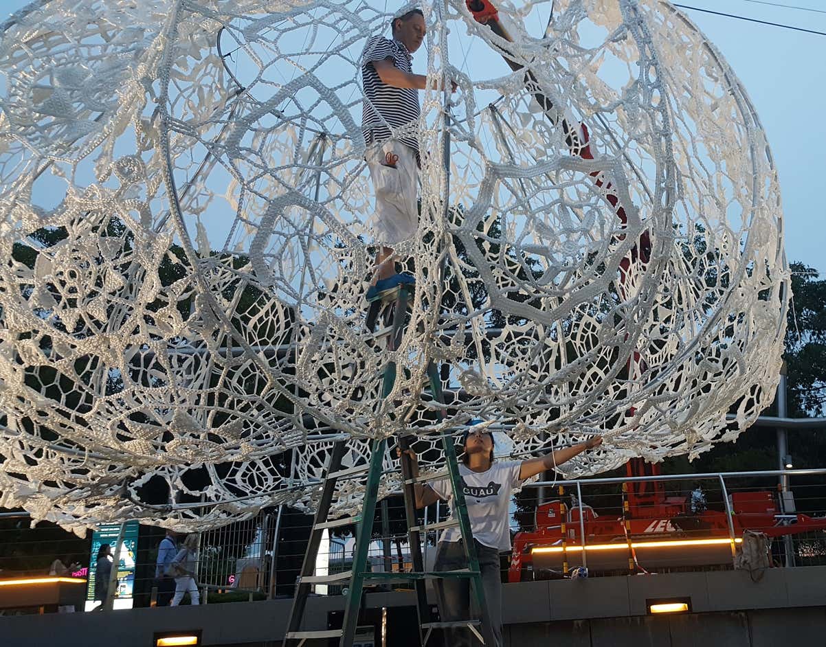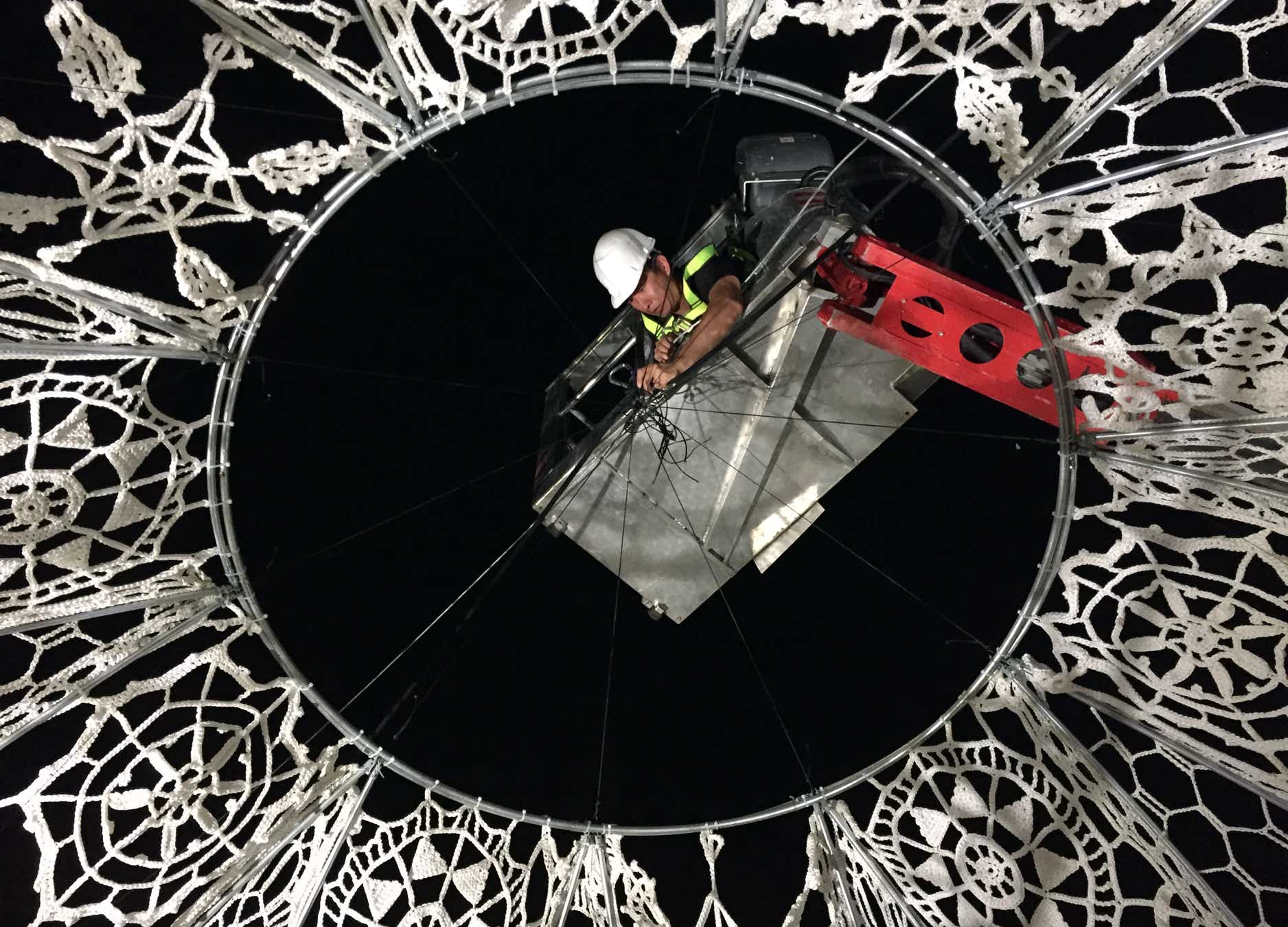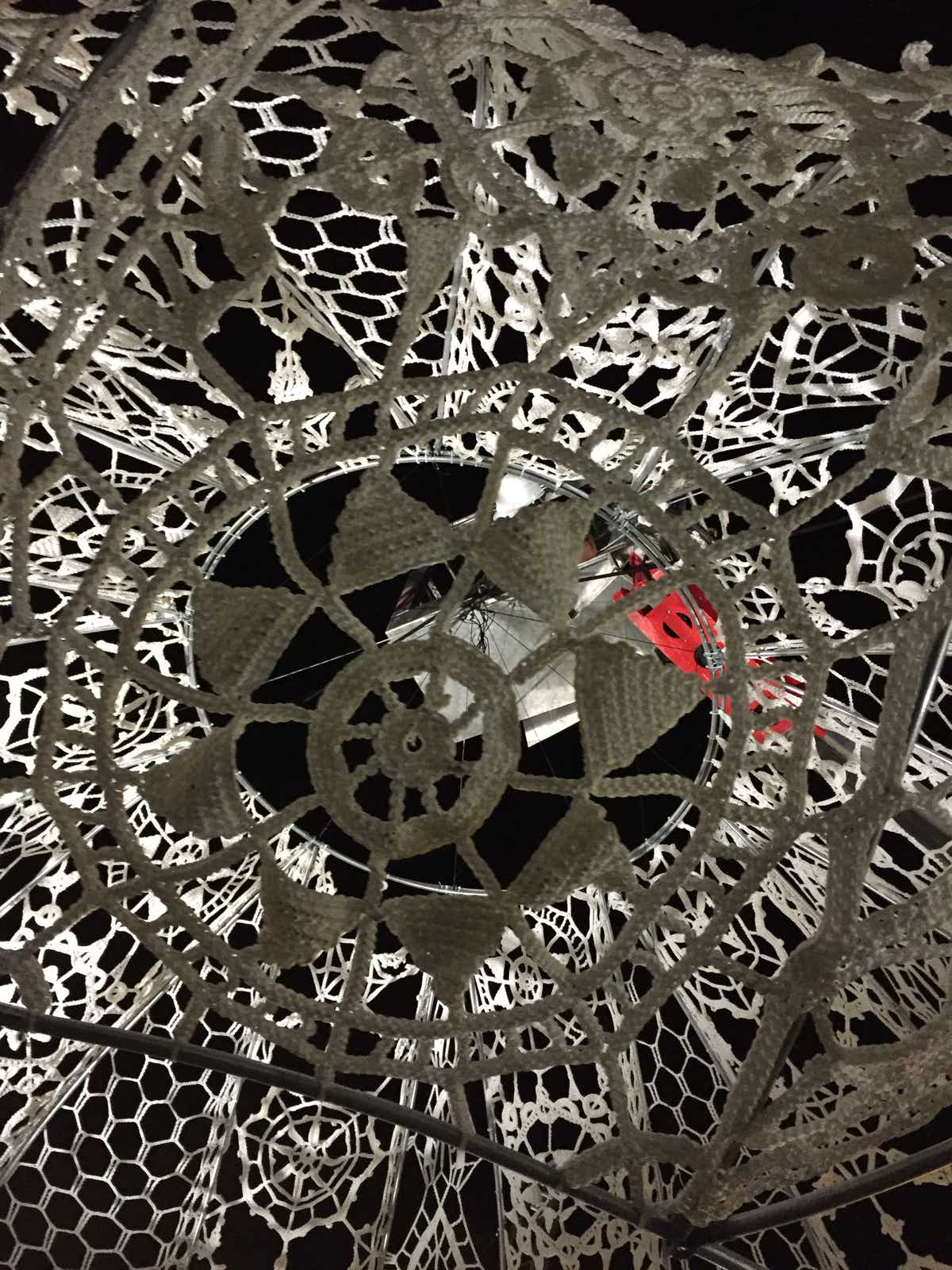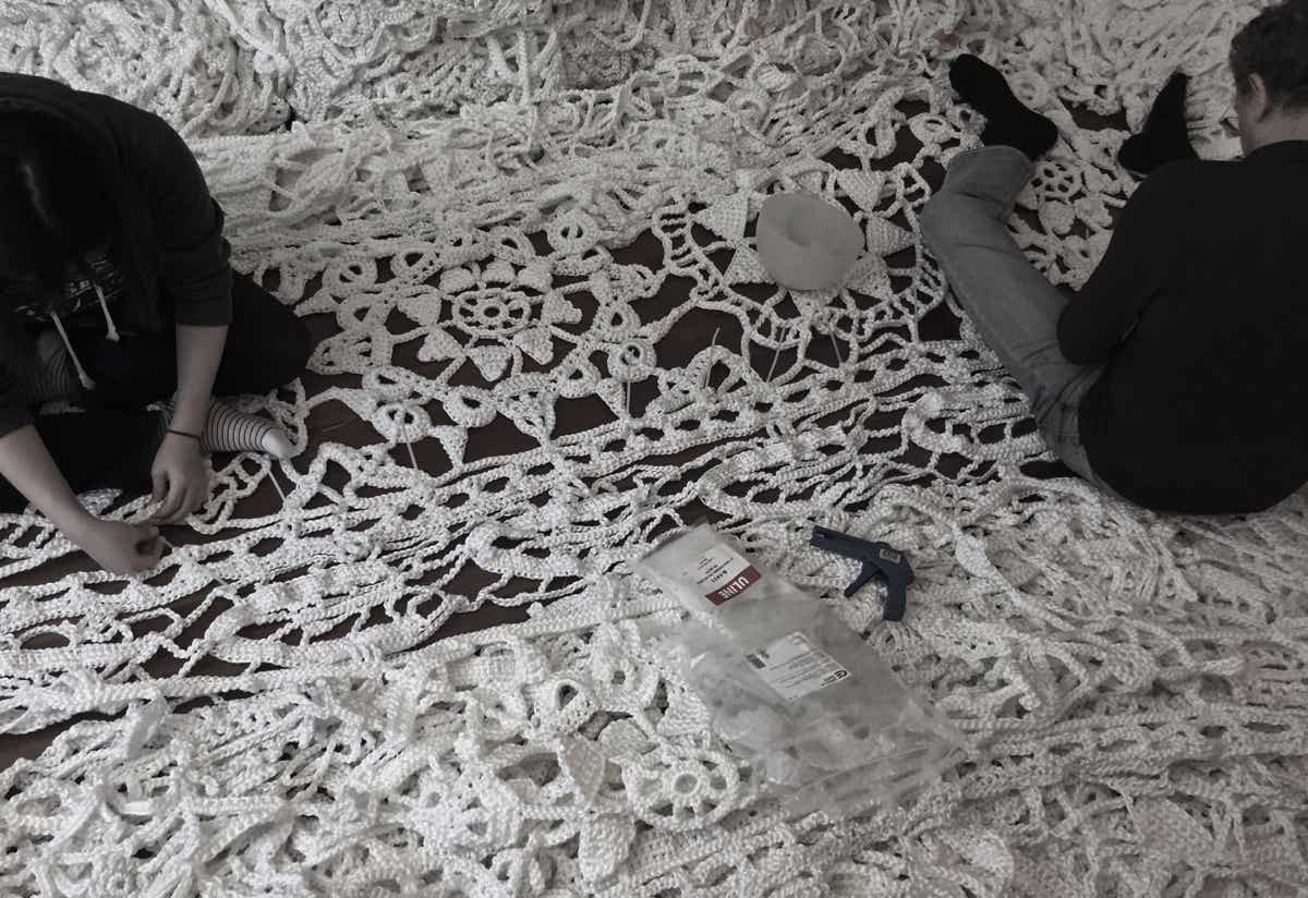 The fabrication and assembly of crochet surface and supporting structure took another two and a half months. Crocheting the surface was a very labor intensive work, which involved 50 people all over the world.