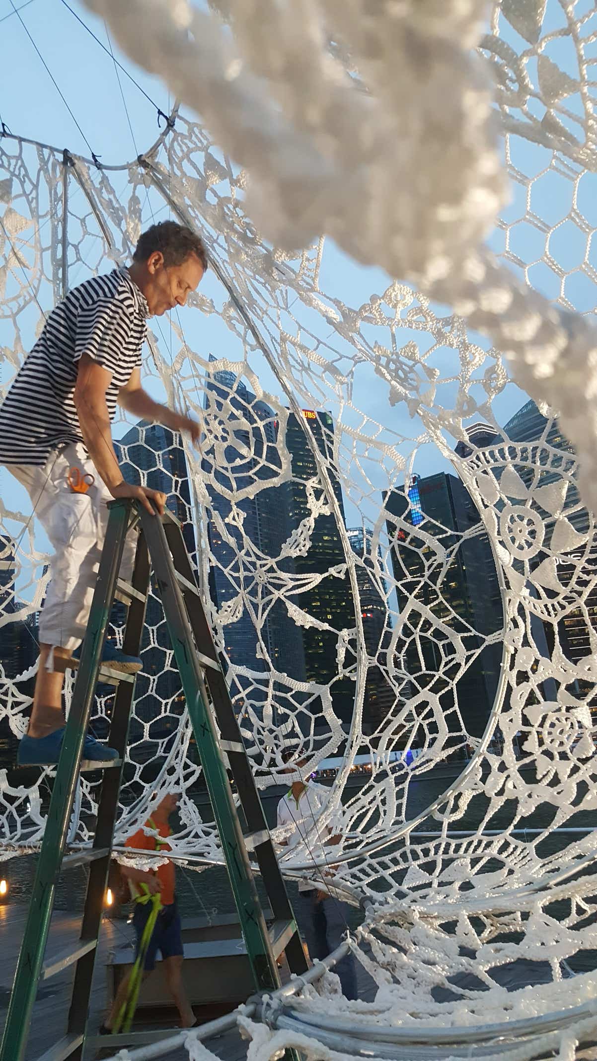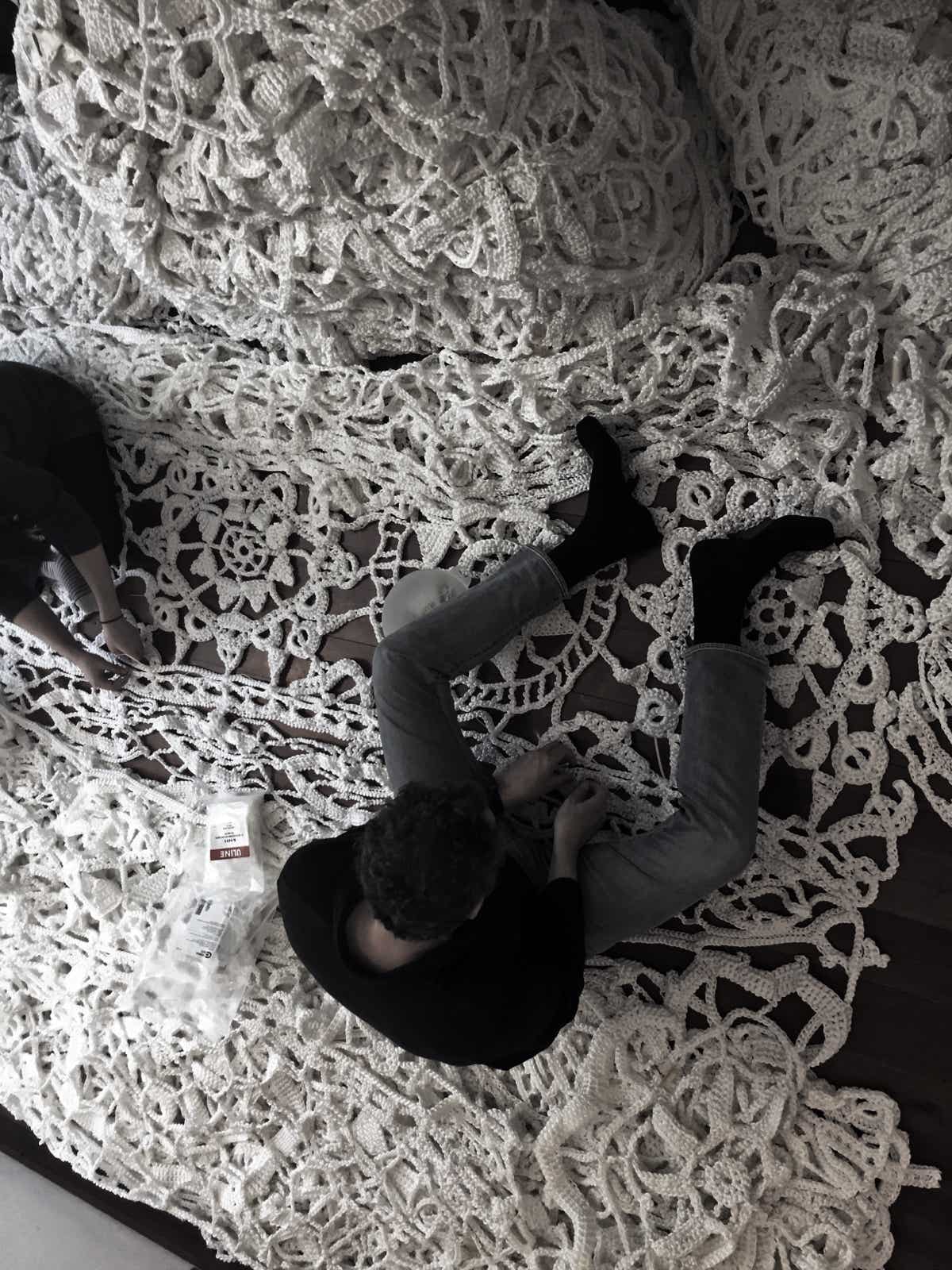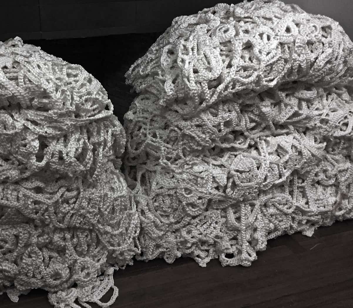 The fabrication and assembly of crochet surface and supporting structure took another two and a half months. Crocheting the surface was a very labor intensive work, which involved 50 people all over the world.
