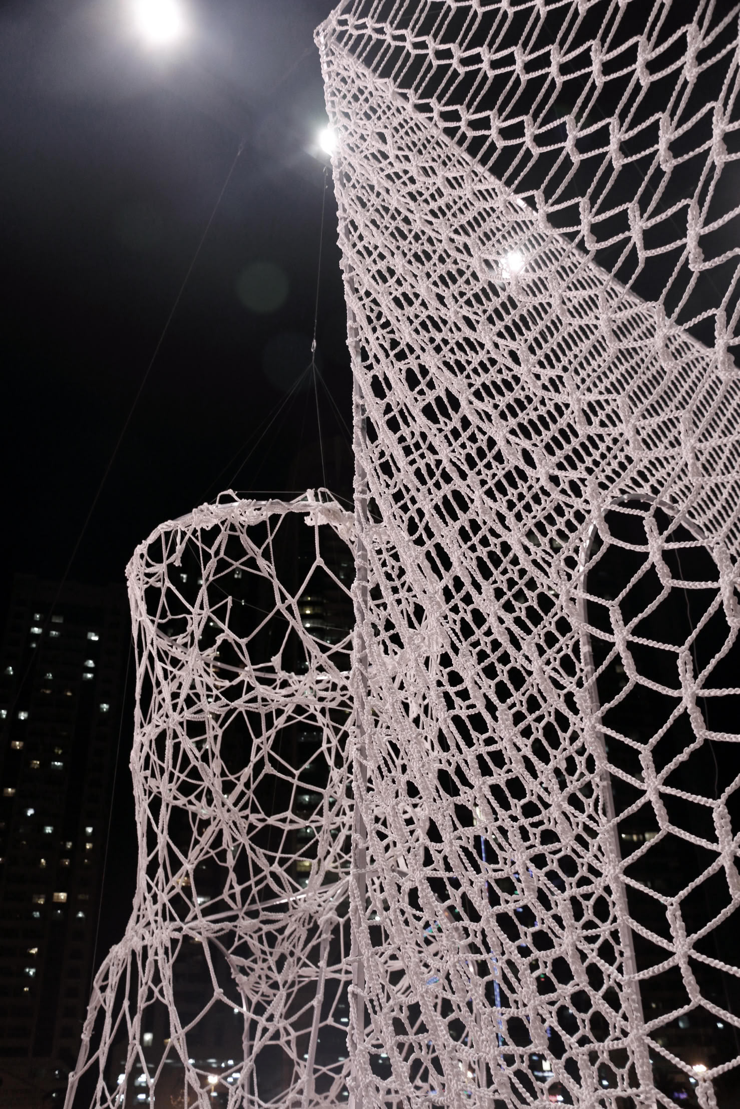 With the wind, the sculptural forms sway and rotate, with their kinetic patterns of shadows. The repetitive movement of the floating forms is rhythmic and calming which contributes to the poetic nature of the work.