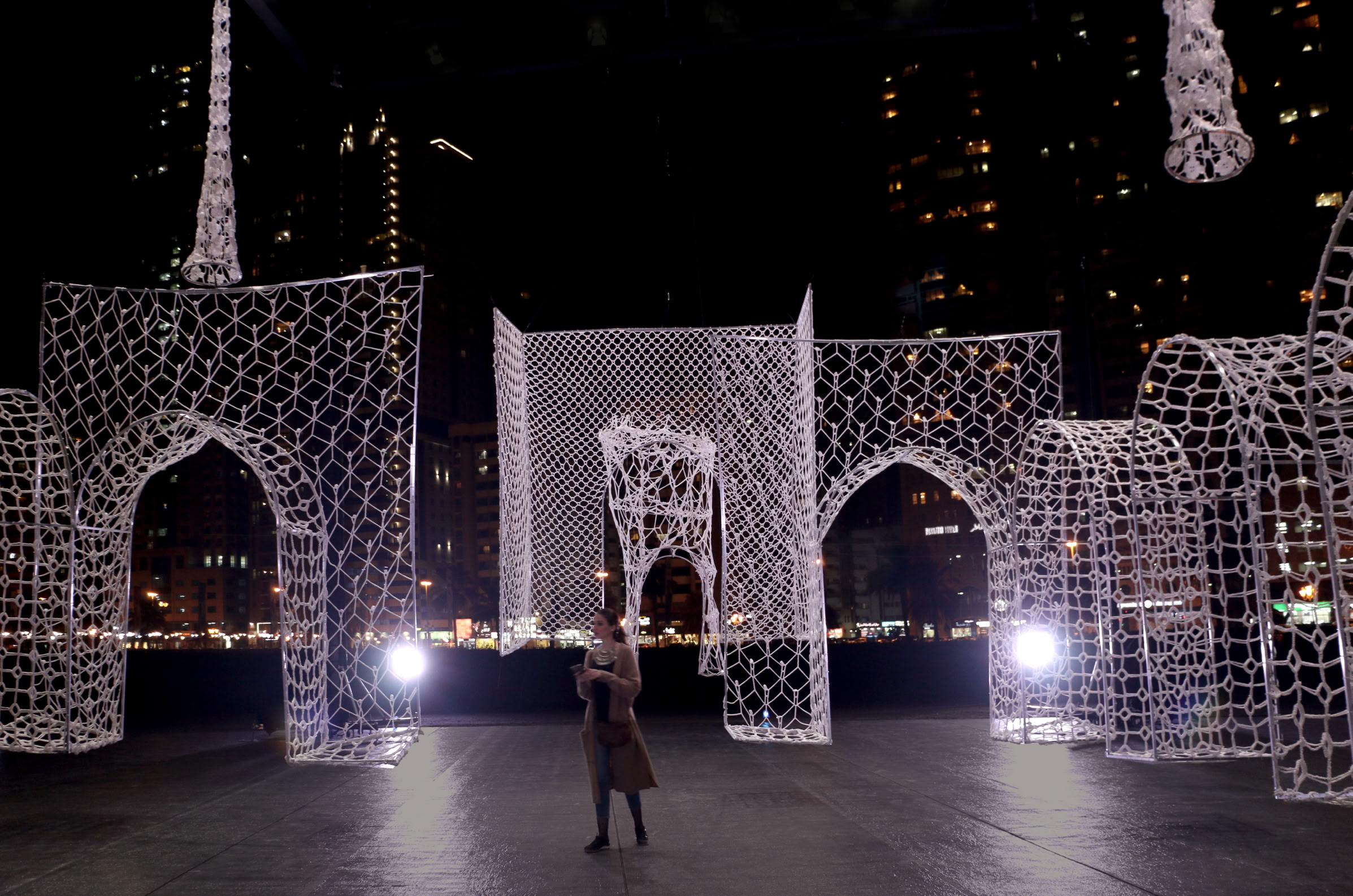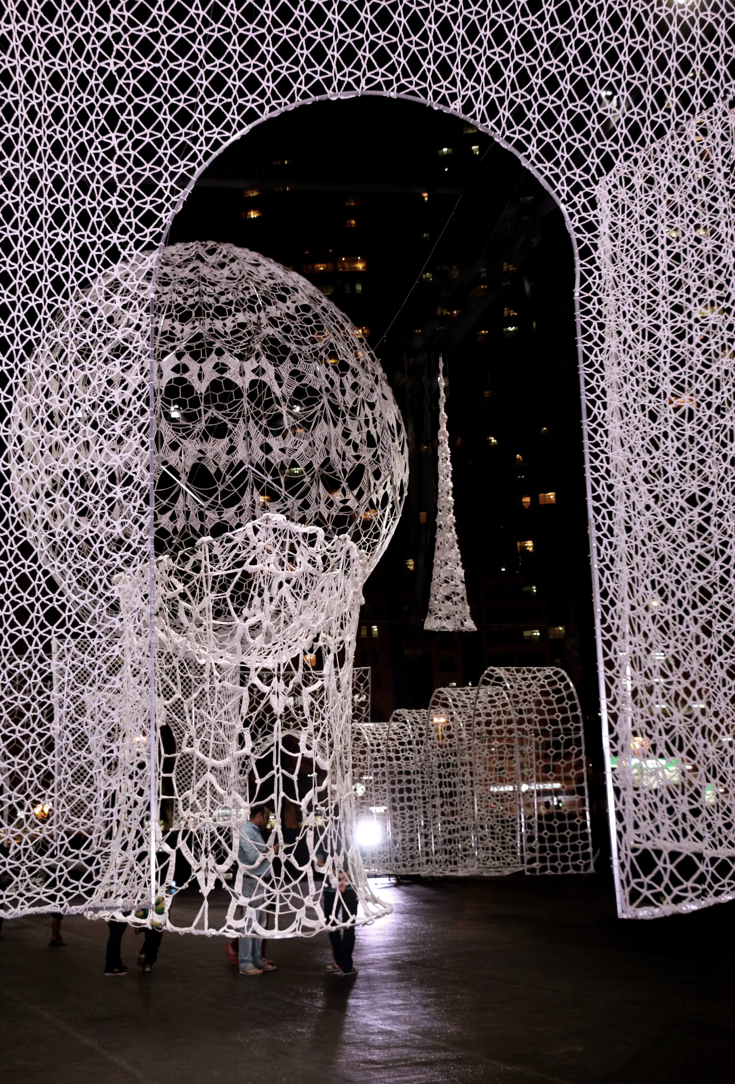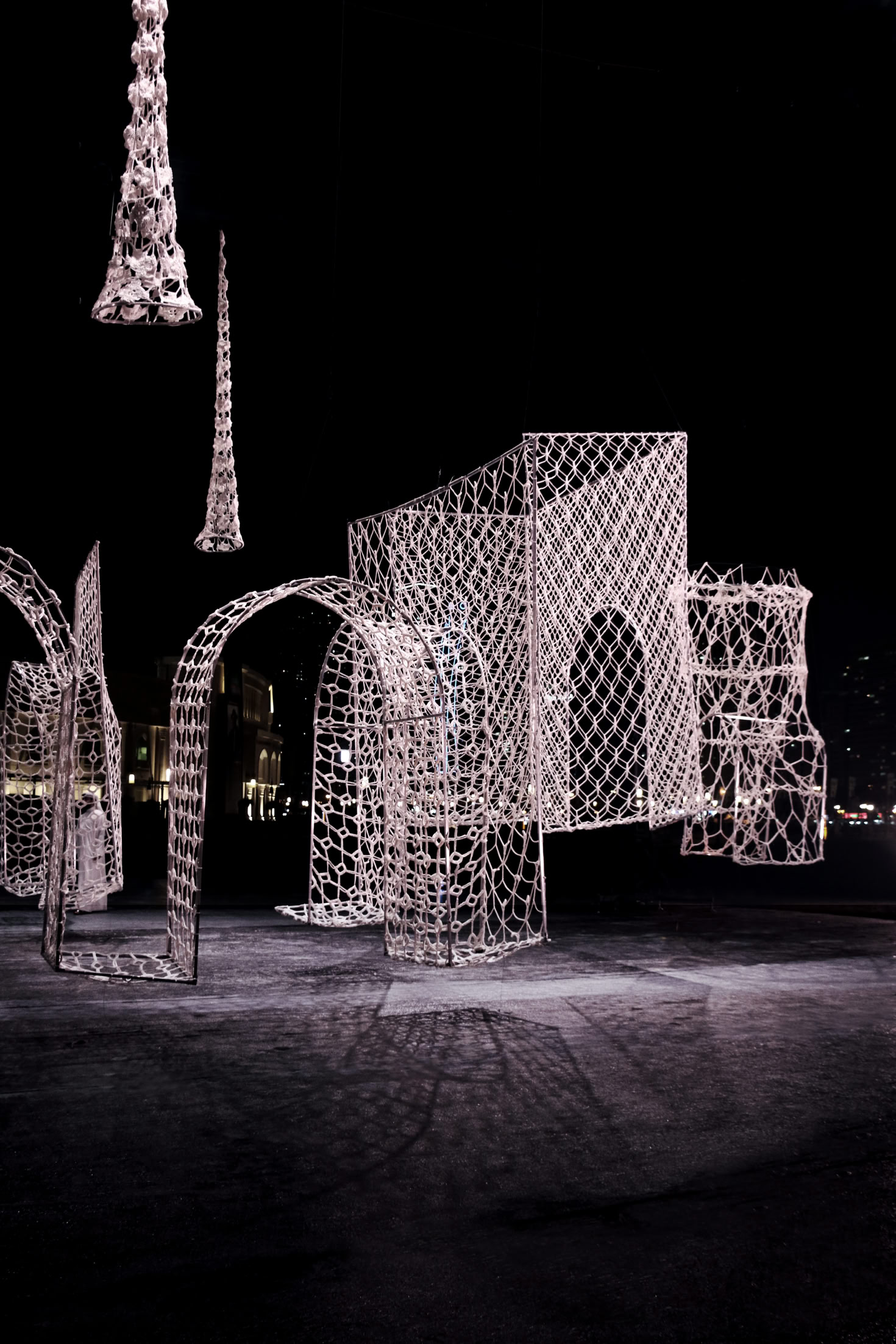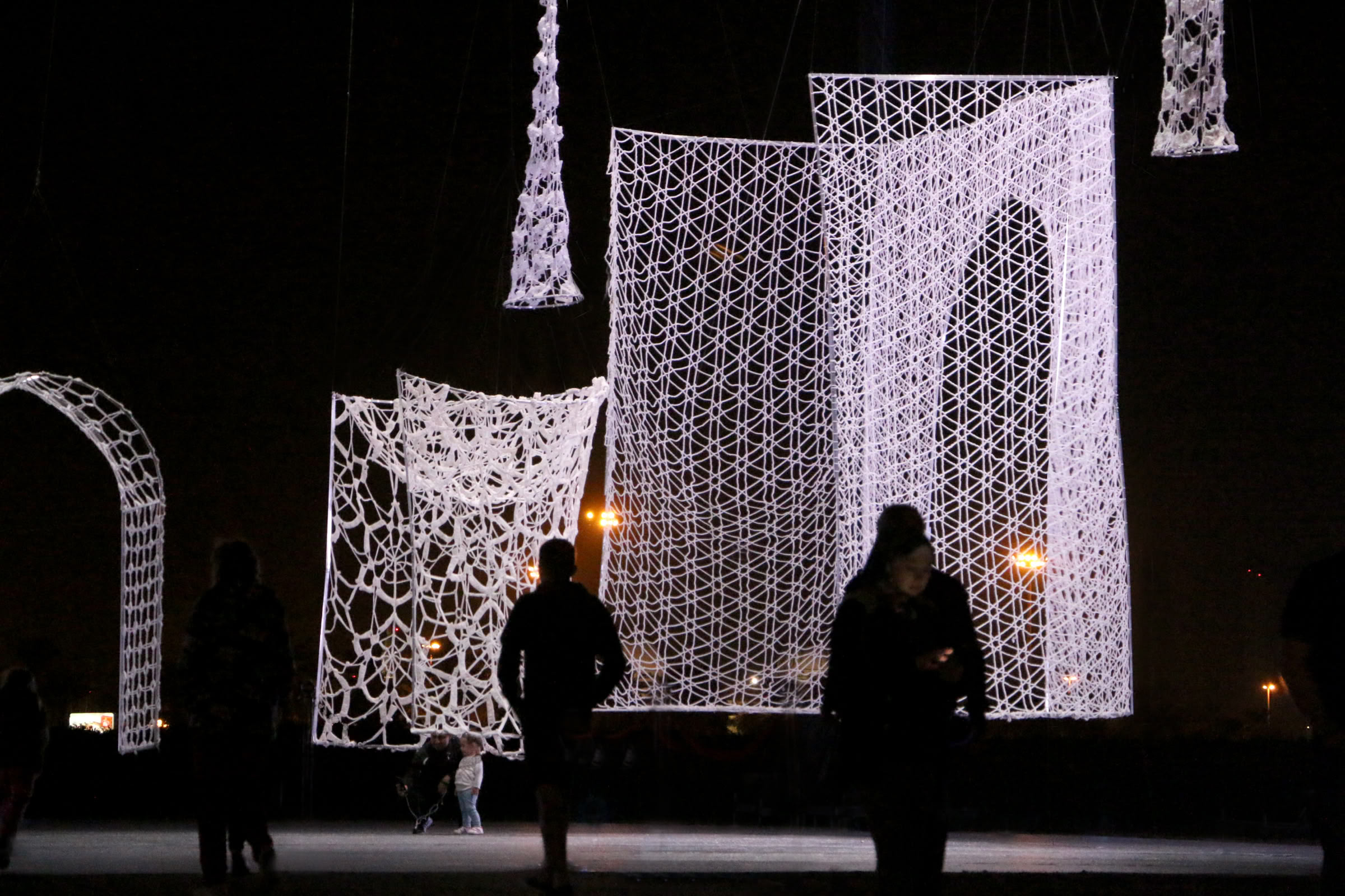 Viewers in glowing lace become “staged’ whereas the lights from the surrounding buildings add to the theatrical effect.