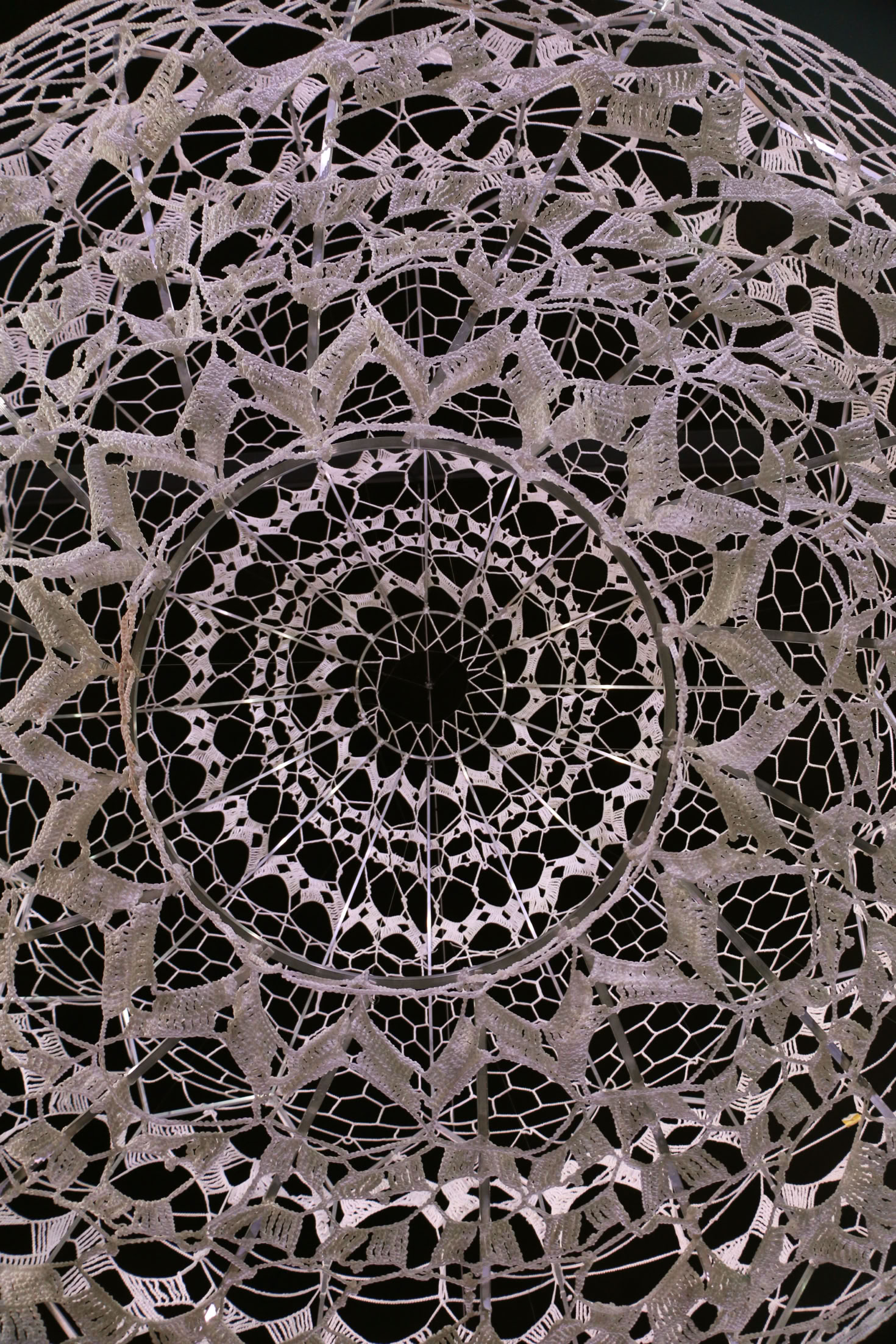 Geometric patterns of the lace overlap to create visual layers with increasing complexity.