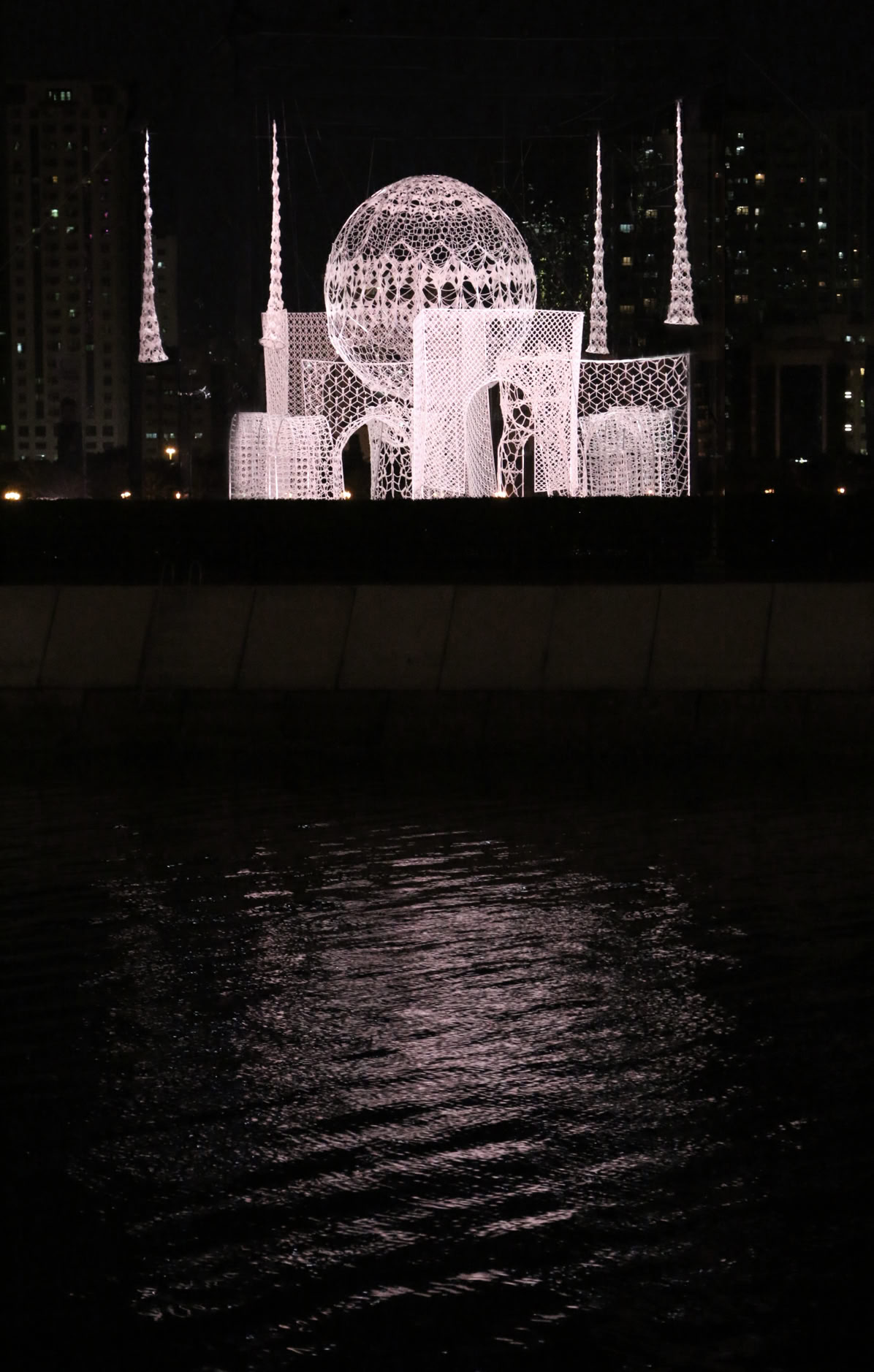 Juxtaposed lace forms are framed within the arch wall, “Qibla” which faces Mecca.