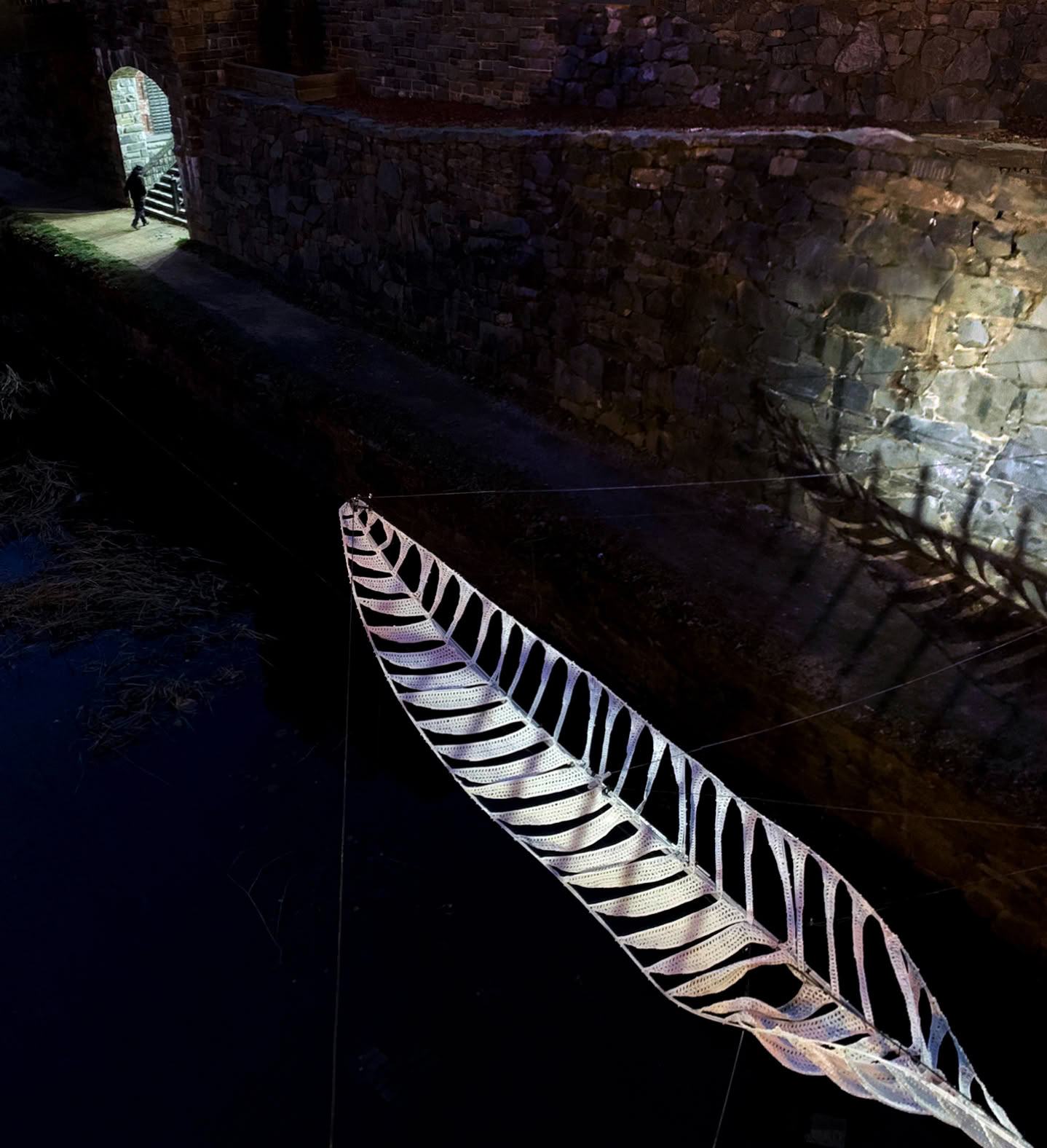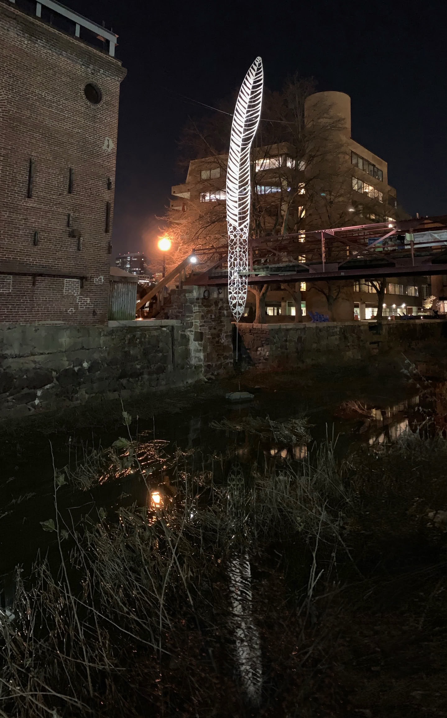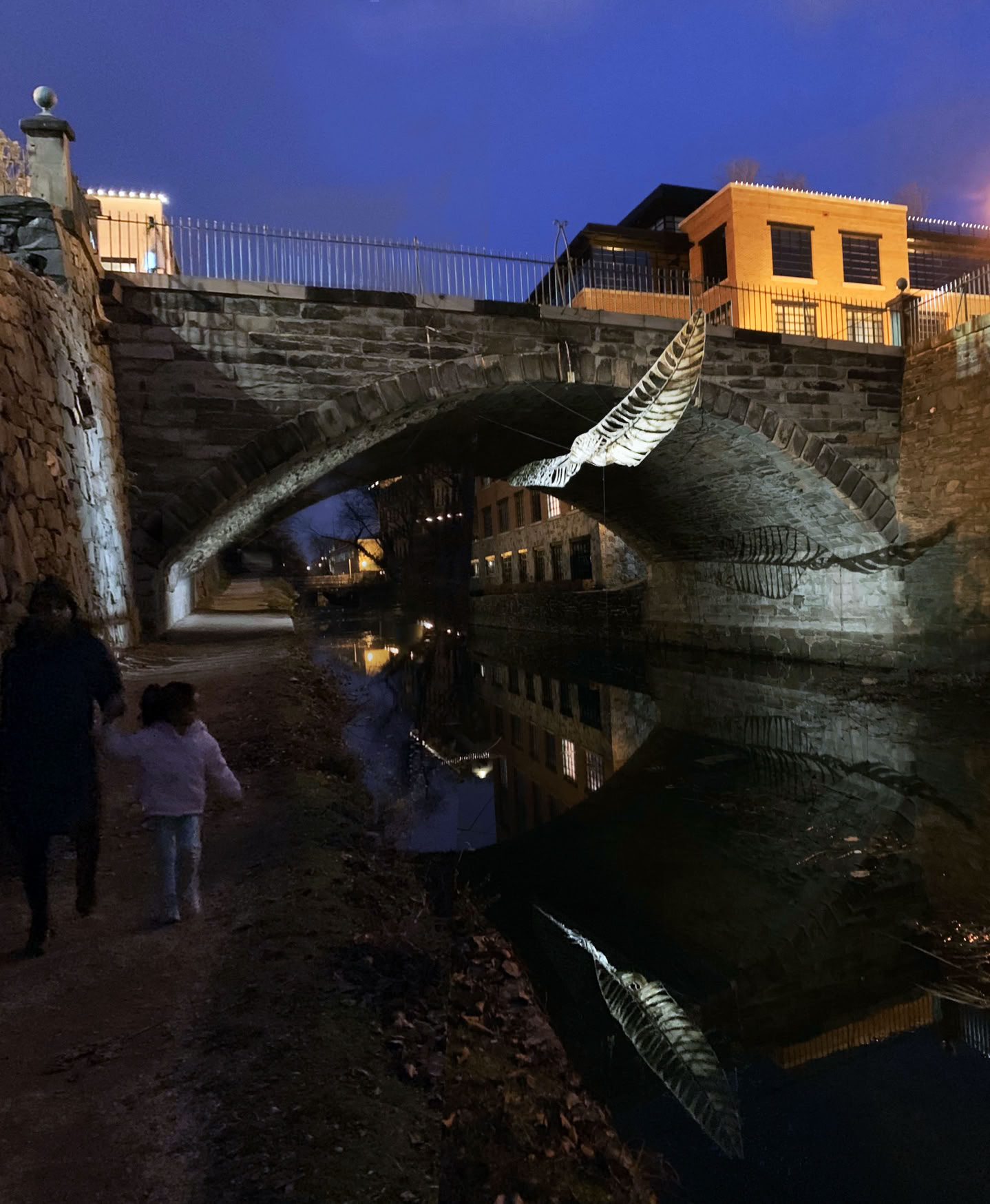 The feathers levitate above the canal, creating sequential views from the bridges above, or a cinematic experience from a stroll or bike ride along the canal. Each feather meets the water and the bridges differently, allowing for the variations of perspectival effect from different sight lines. The Heron creates a spatial experience for the viewers, prompting interaction with the art and among people. The mysteriously glowing lace feathers, hovering above the historic canal in the heart of the vibrant city create a sense of place that is unique to Georgetown.
