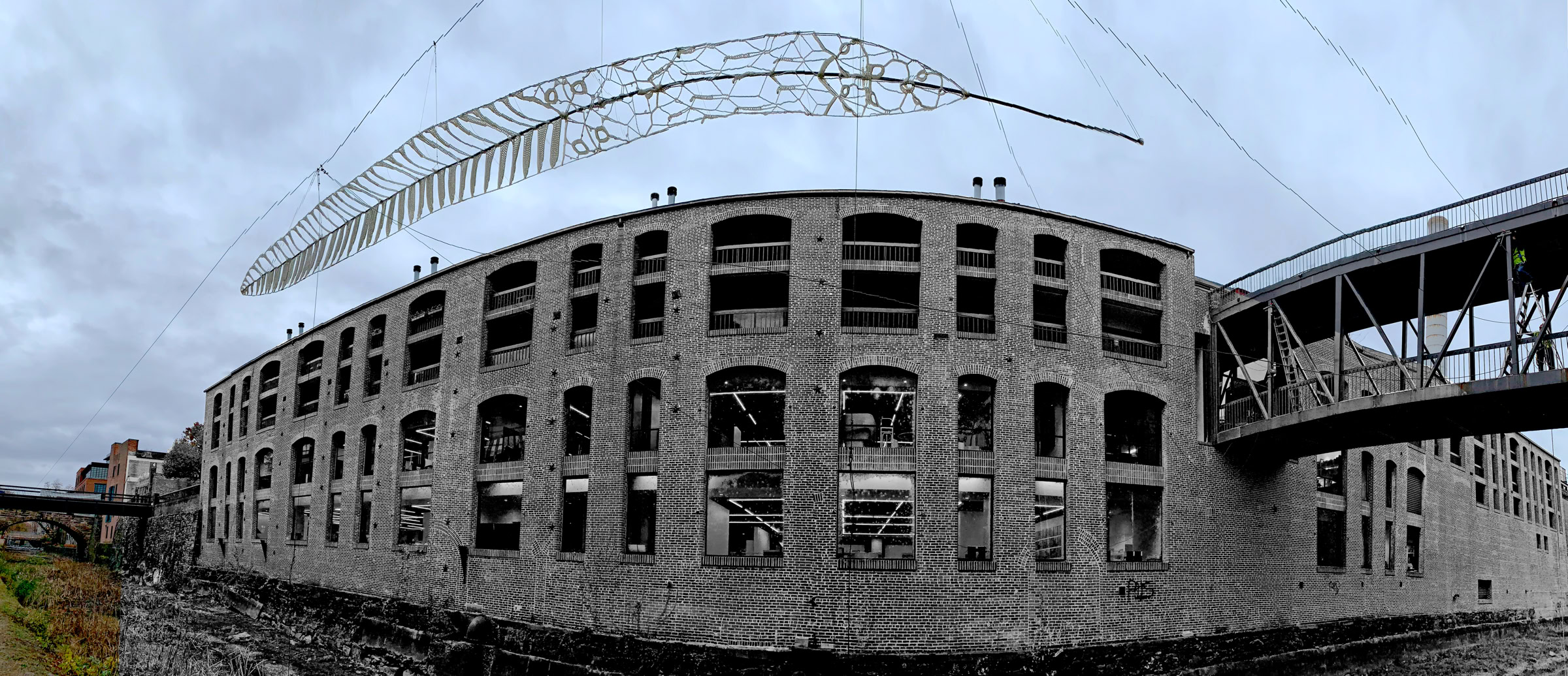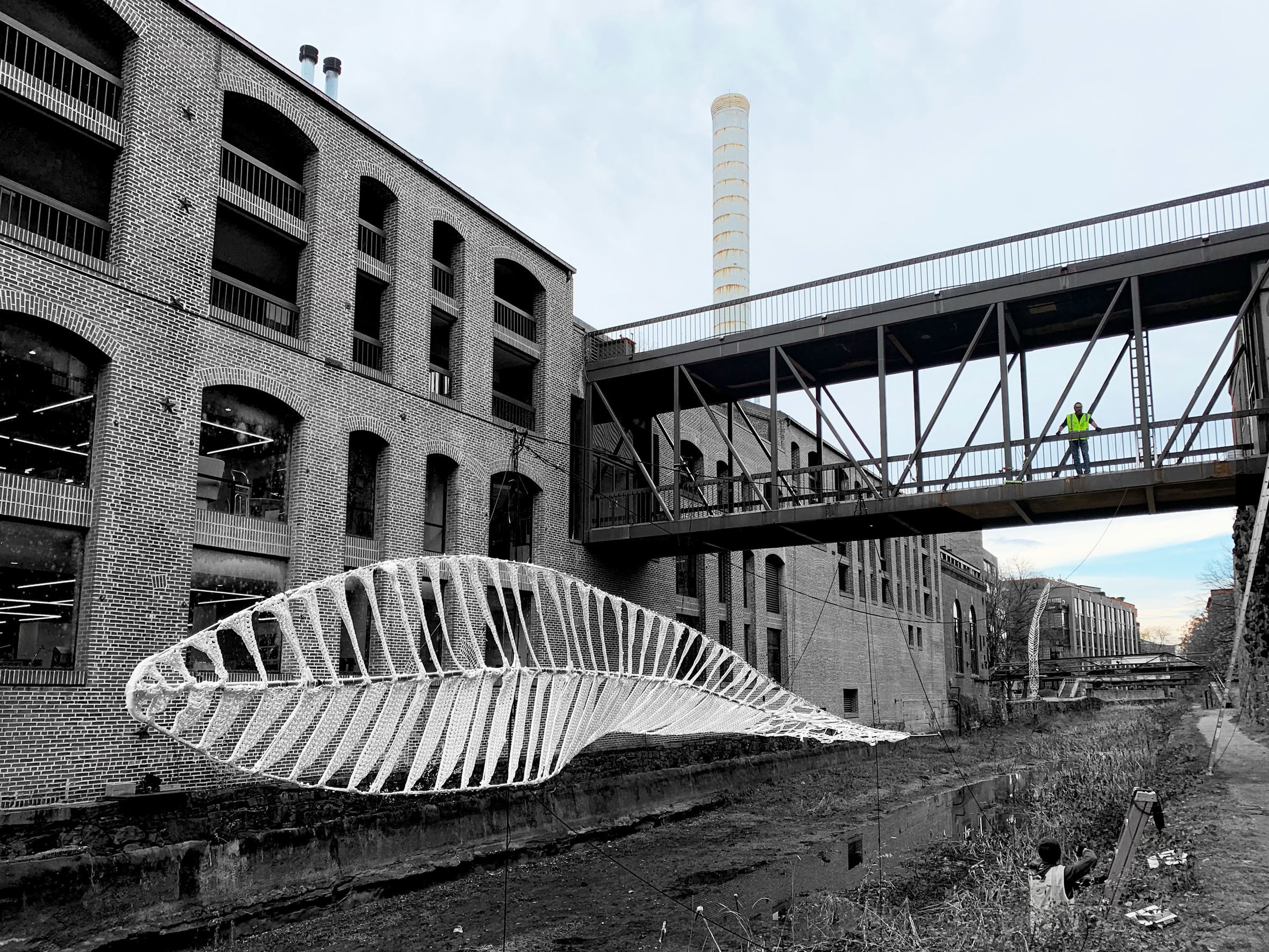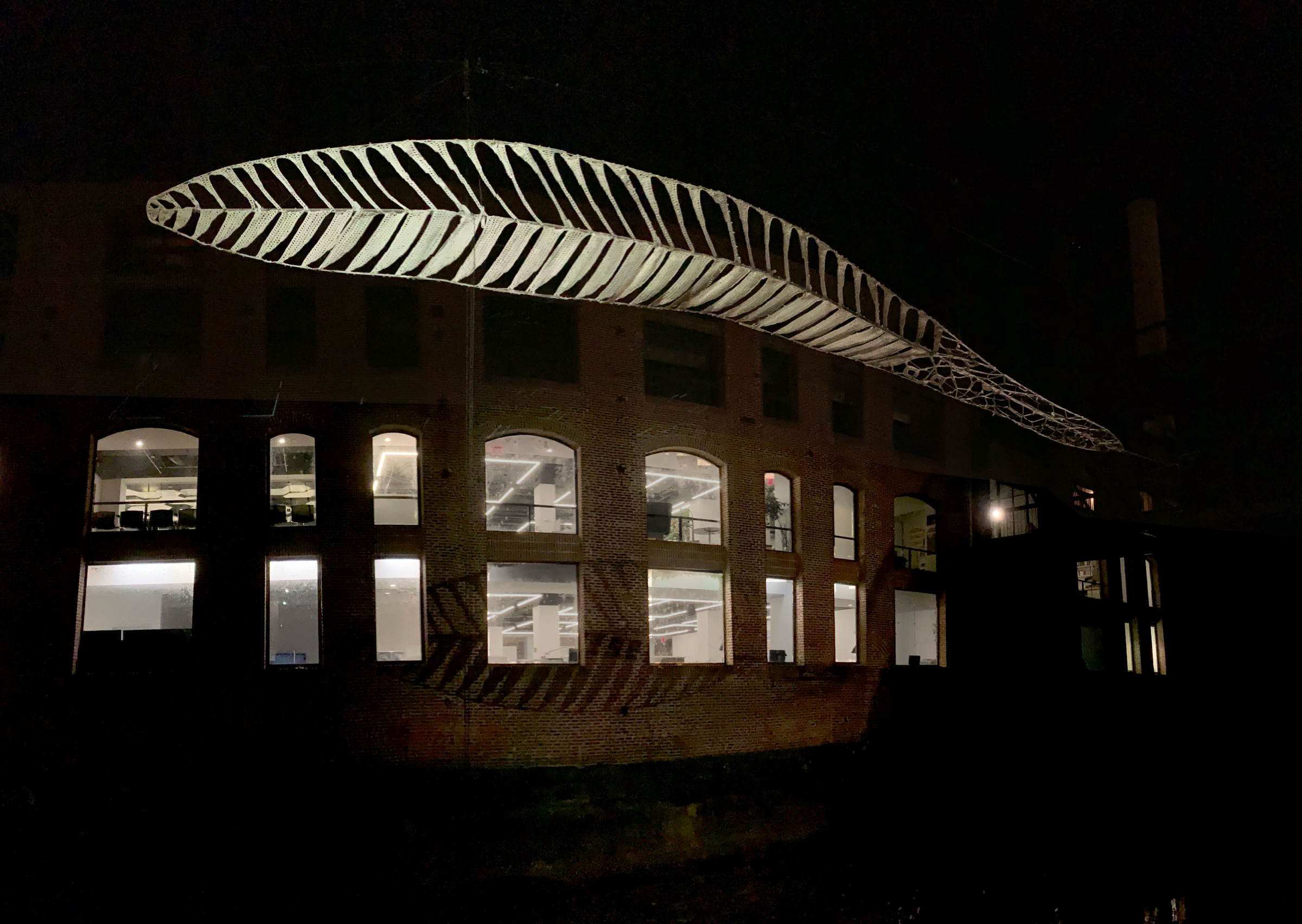 The feathers levitate above the canal, creating sequential views from the bridges above, or a cinematic experience from a stroll or bike ride along the canal. Each feather meets the water and the bridges differently, allowing for the variations of perspectival effect from different sight lines. The Heron creates a spatial experience for the viewers, prompting interaction with the art and among people. The mysteriously glowing lace feathers, hovering above the historic canal in the heart of the vibrant city create a sense of place that is unique to Georgetown.
