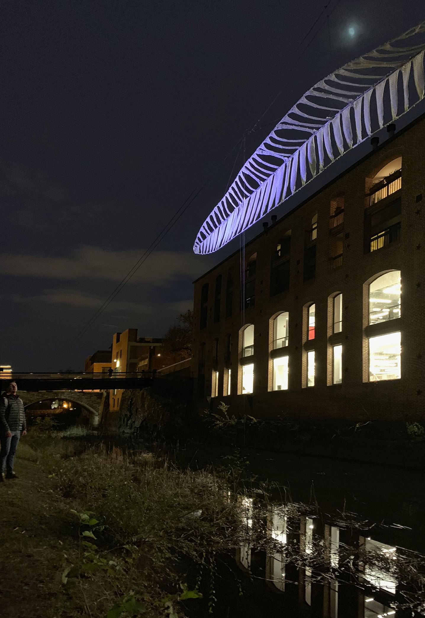 The contrast of the softly glowing diaphanous feathers in feminine curvature against a masculine urban space interrupts our mundane and coherent everyday, creating a sense of surprise that ignites imagination. The project aspires to evoke a sense of wonder though this unexpected encounter, which forms a lasting visual poetry as a prelude to the renewed canal due to arrive in the near future.