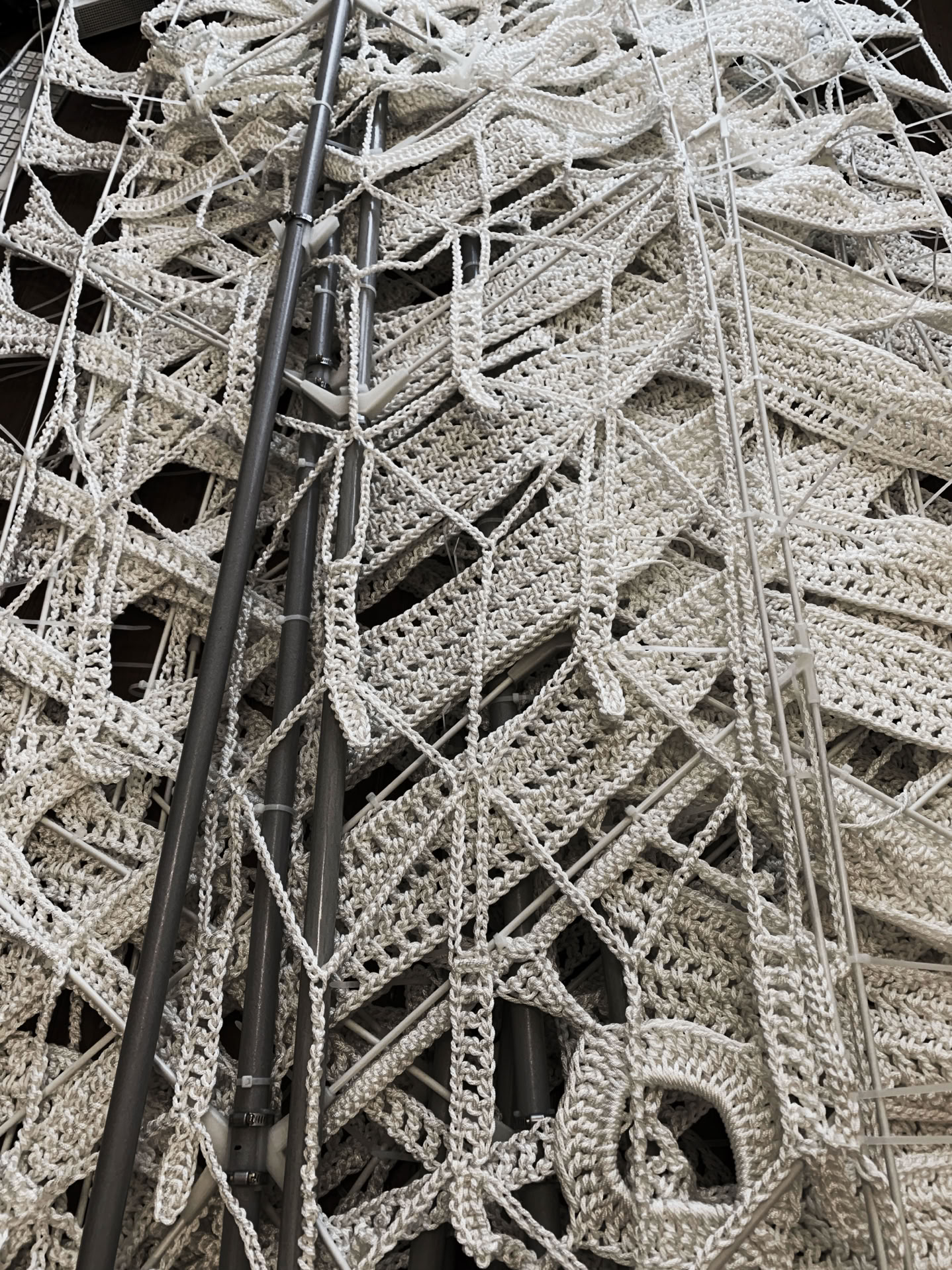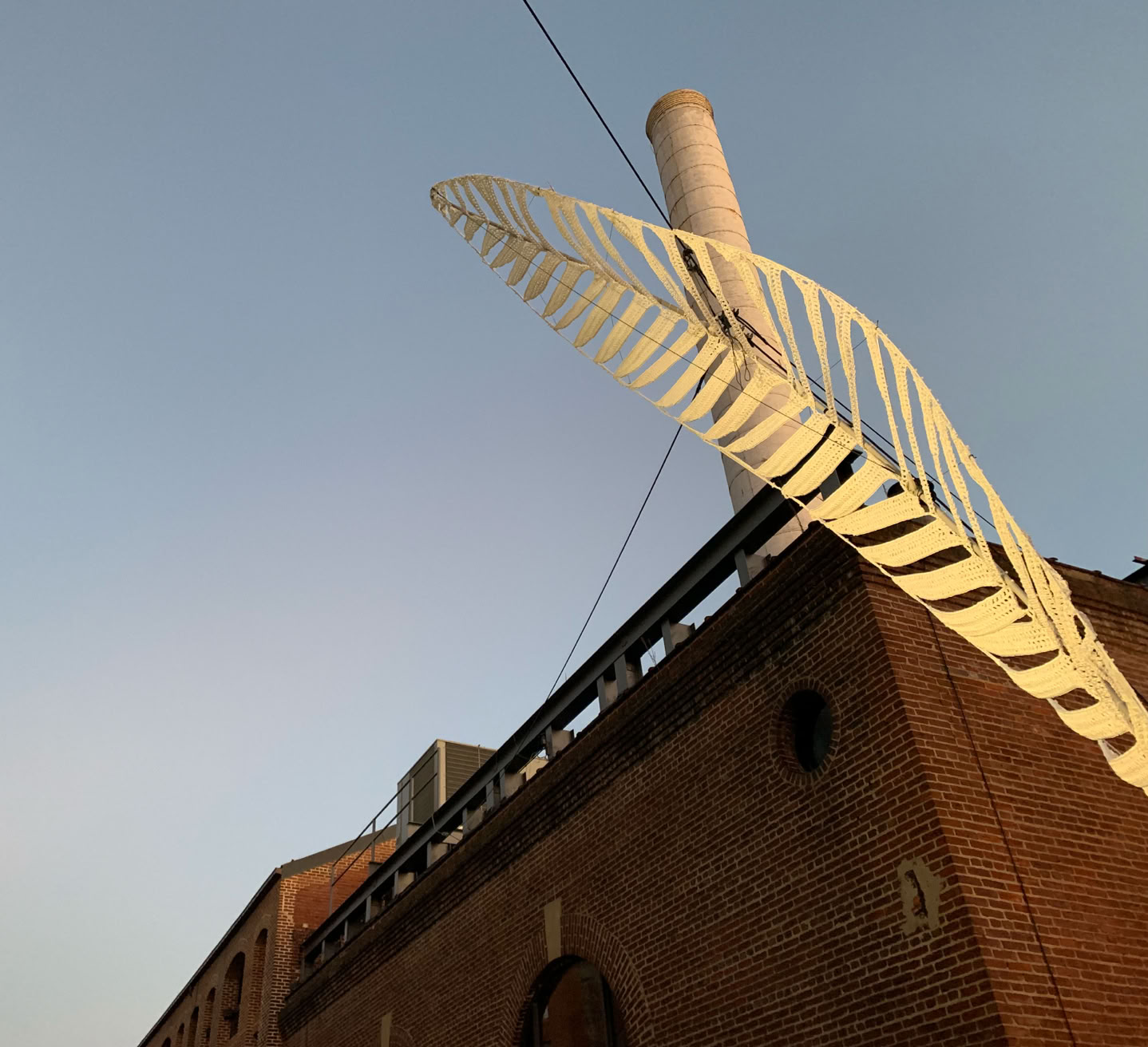 The Heron creates a unique sense of place with intricate, calm and simple objects. It is composed of individual feathers made of hand crocheted lace in an unusual scale. Generally, lace is small in scale, and often private, used as an embellishment for a special celebration. Shown in a large scale in a public place, this lace creates a sense of surprise which contributes to the memory of the space.