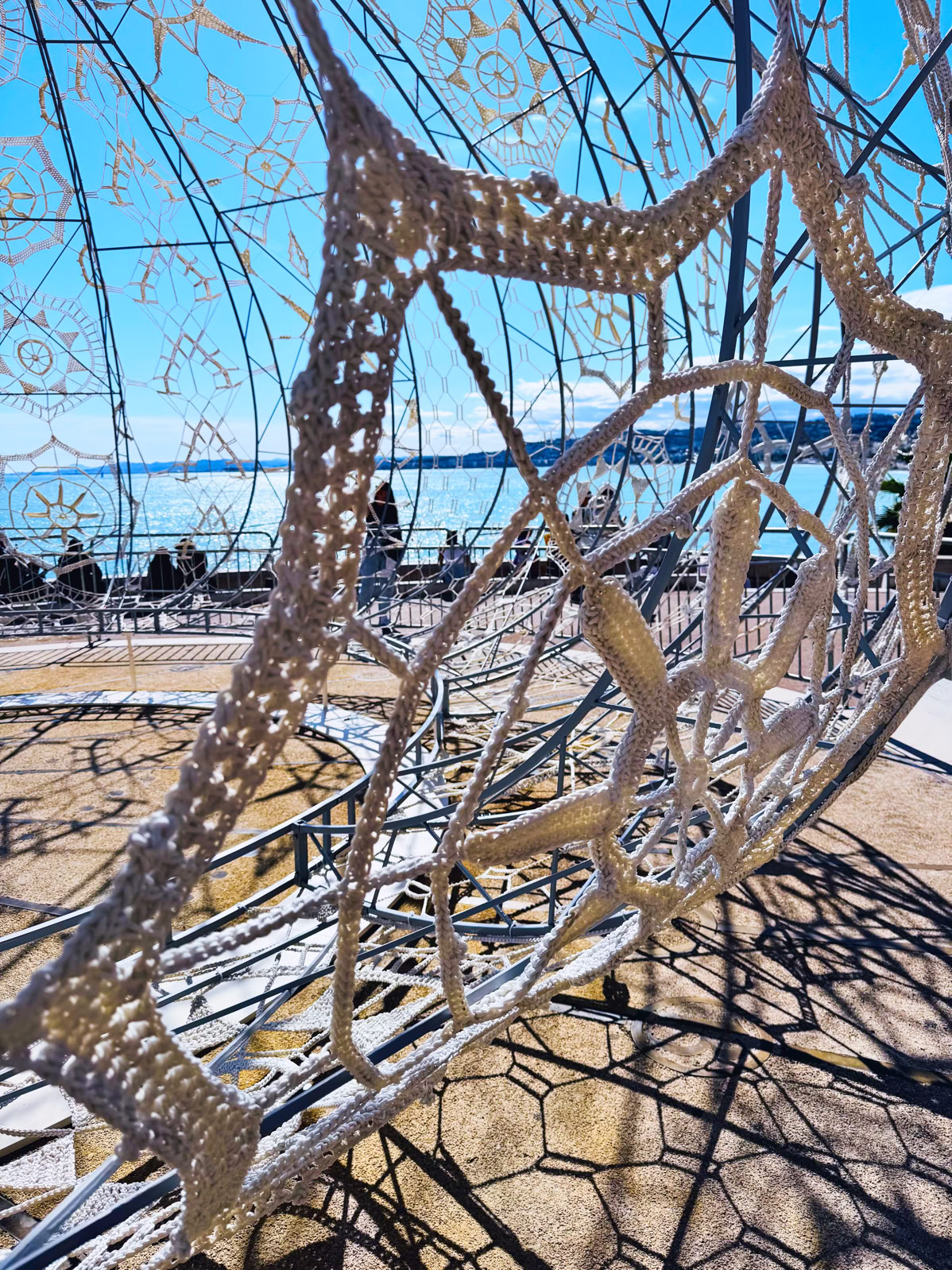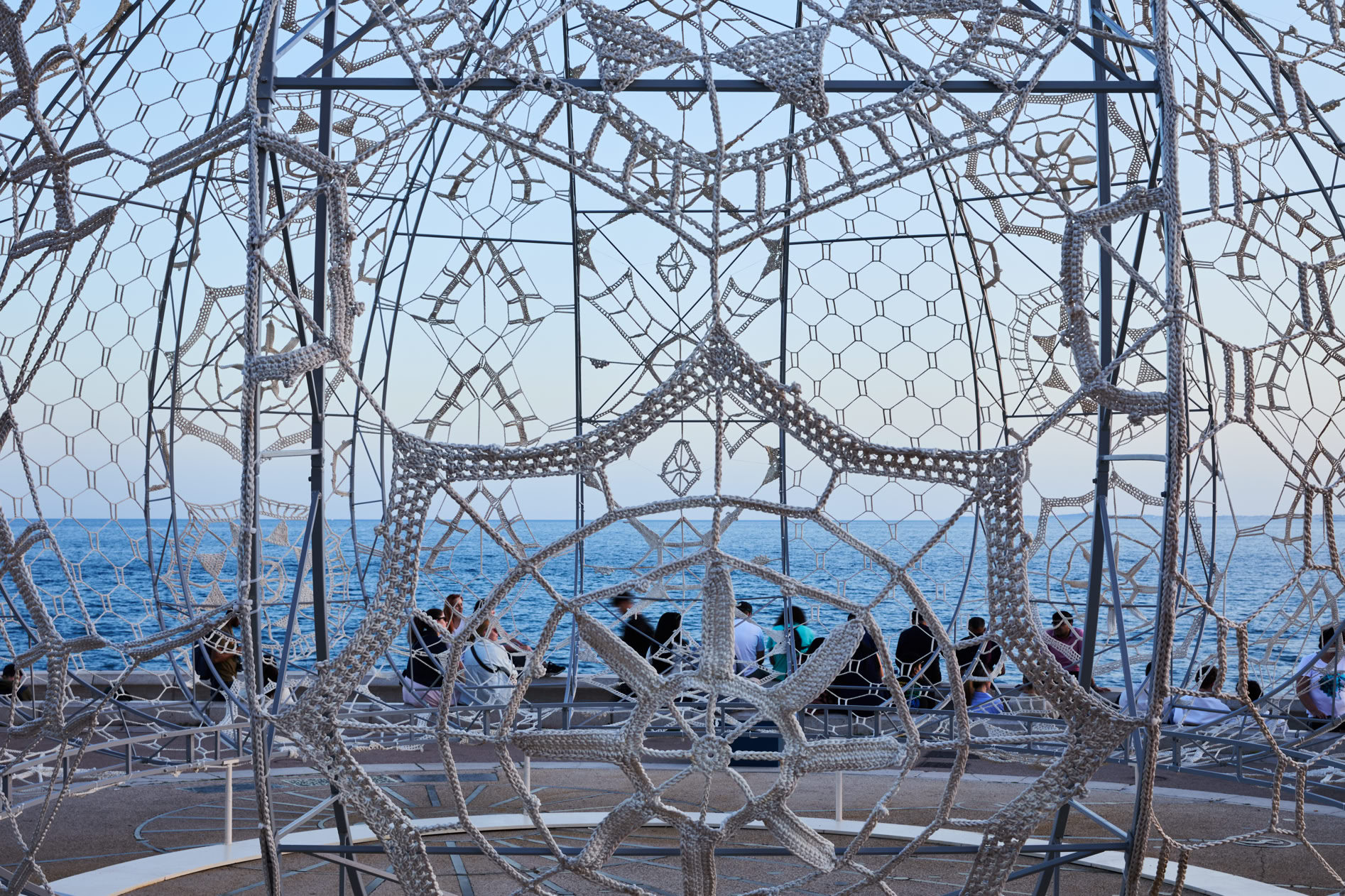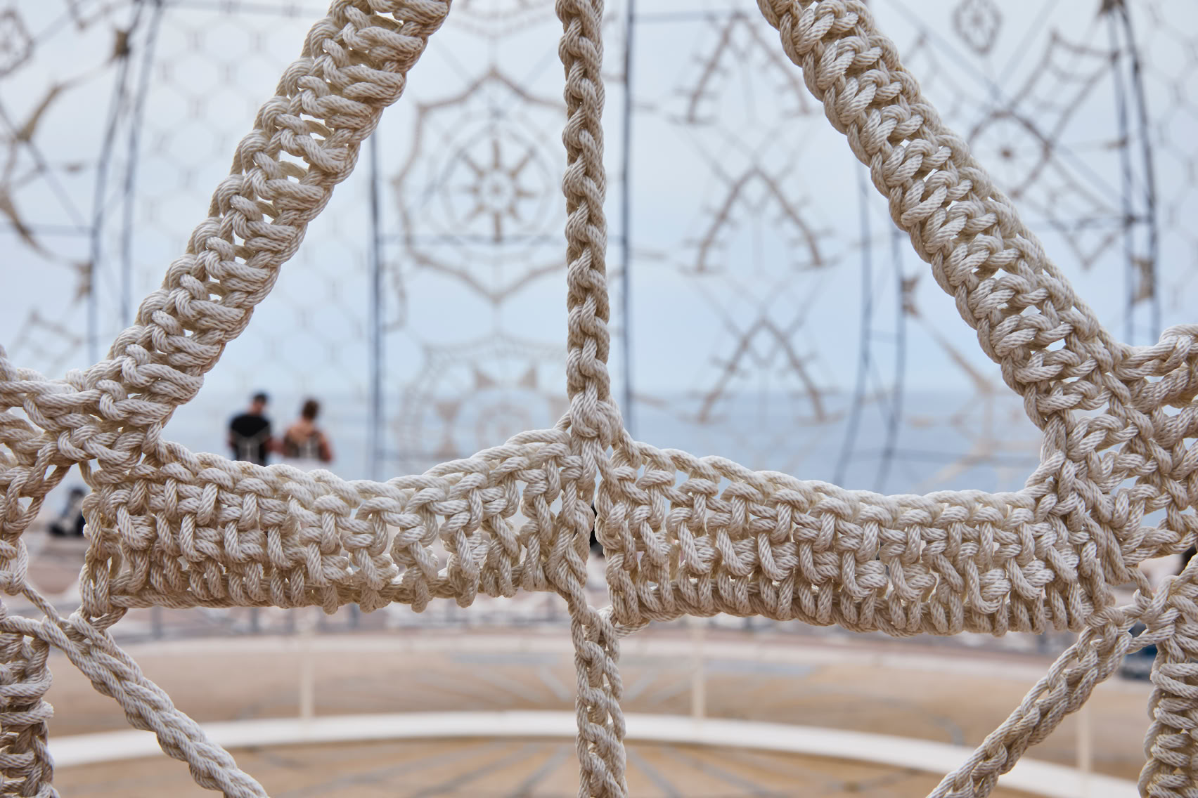 Urchins (sea urchin), refers to sea creatures while honoring textile and fishing heritage. The work is made from hand-crocheted fishing rope. It was created in the metropolis of Barcelona by 120 local residents. Its motifs evoke those of lace collected throughout Europe and Catalonia. Through this technique traditionally associated with women, Urchins pays tribute to women's ongoing struggles for equality and respect.