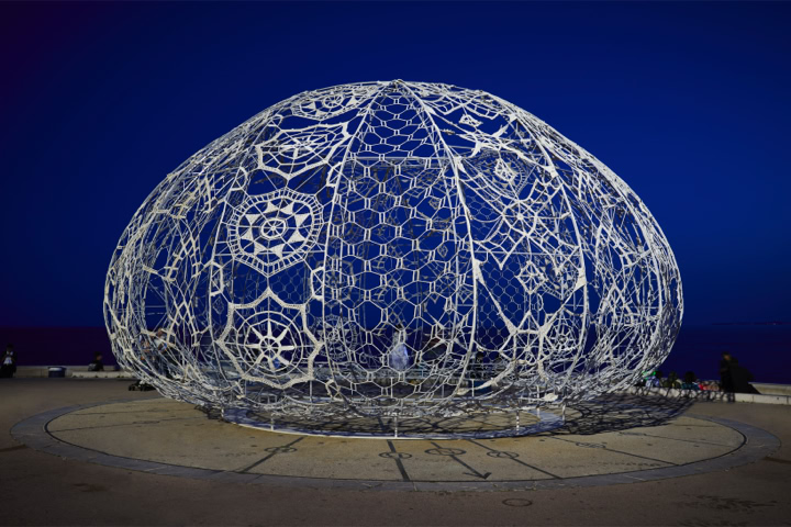 Le jour, la sculpture permet de contempler le paysage à travers ses motifs. La nuit, elle se transforme en lanterne magique, évoquant les créatures bioluminescentes qui peuplent les océans.