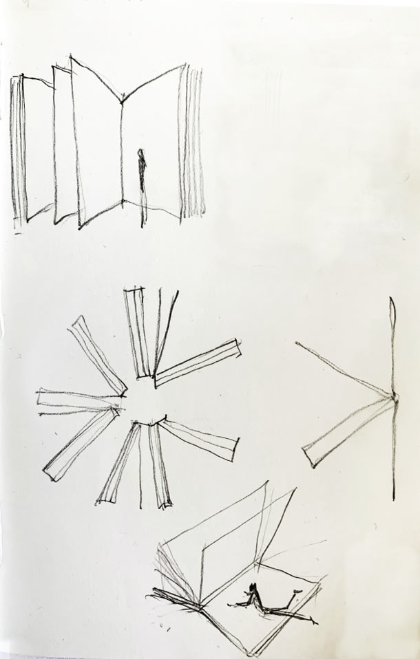 Sketches for The Open Book: Multiple views showing possible arrangements of multiple books