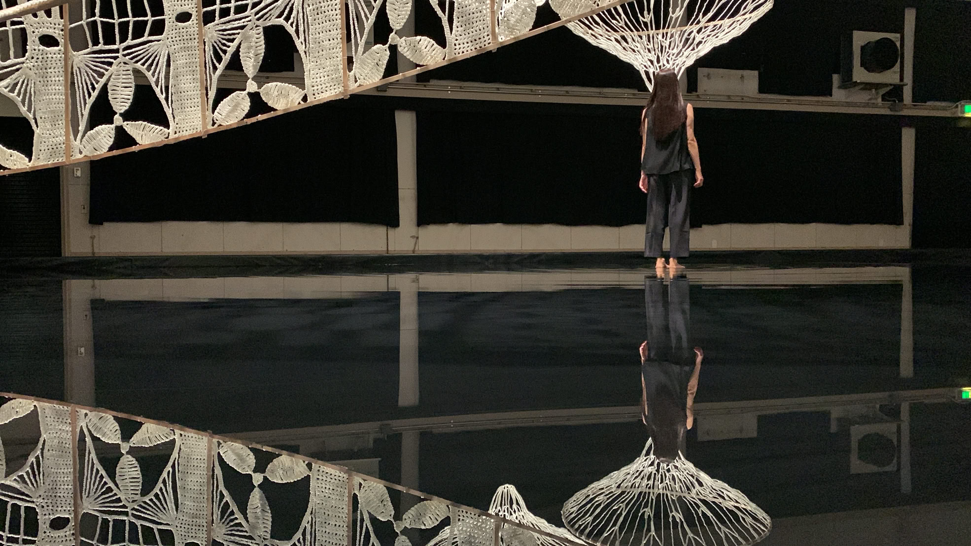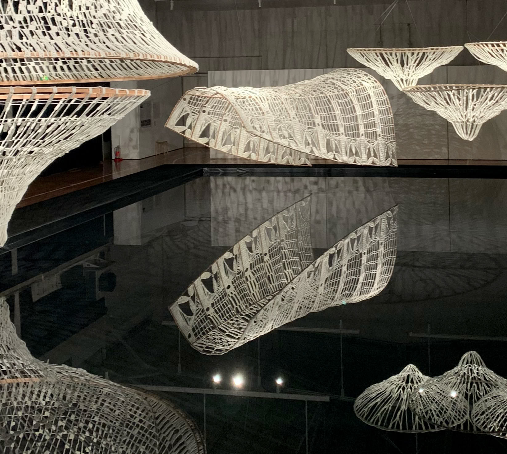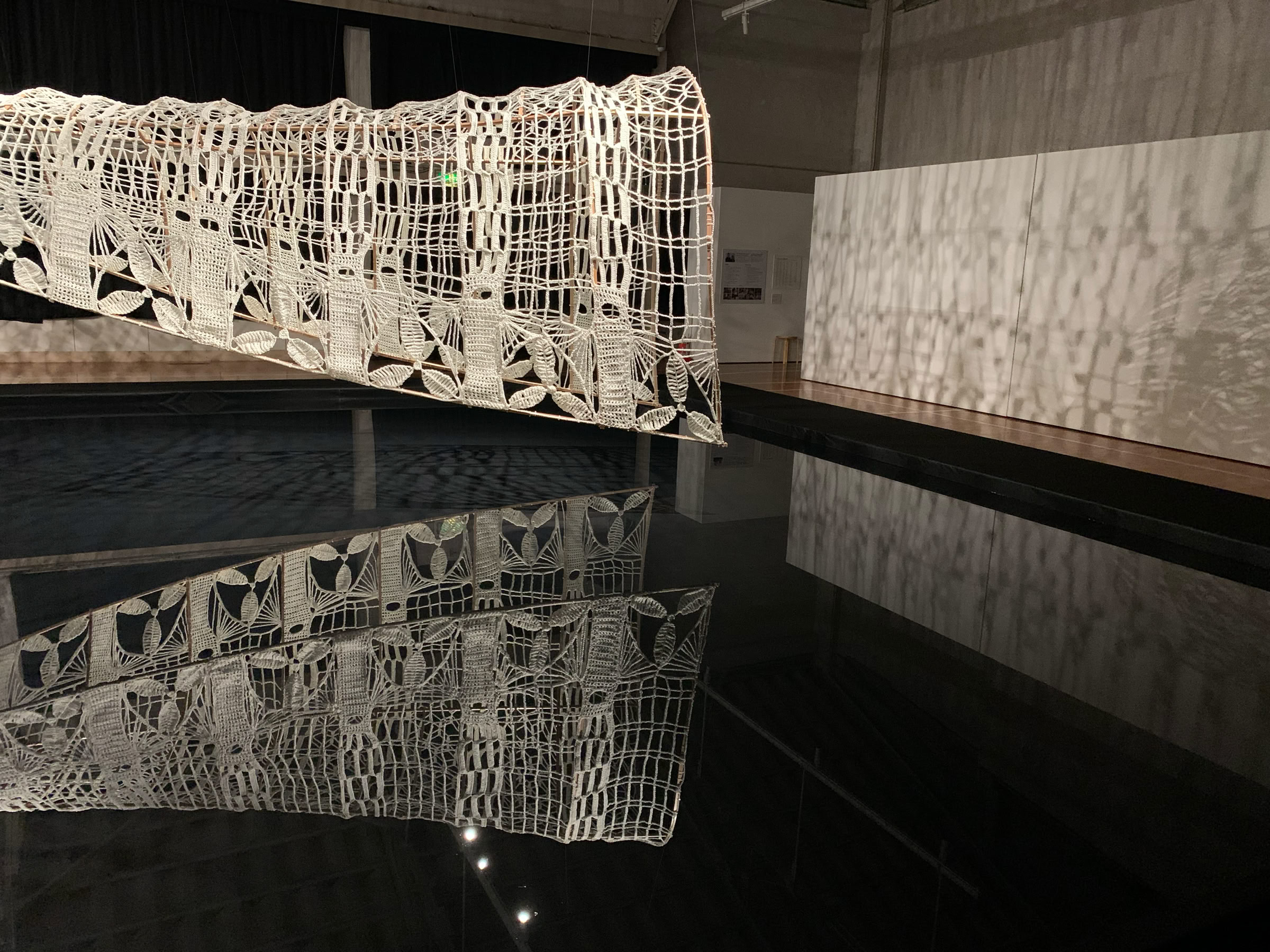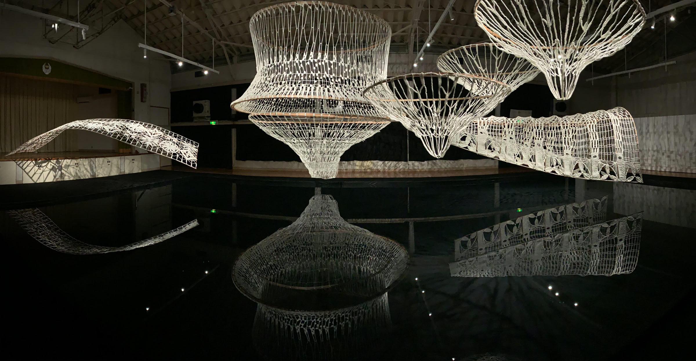 The work is comprised of simplified geometric lace forms found in iconic Japanese temples and shrines, detached and suspended over the dark water.