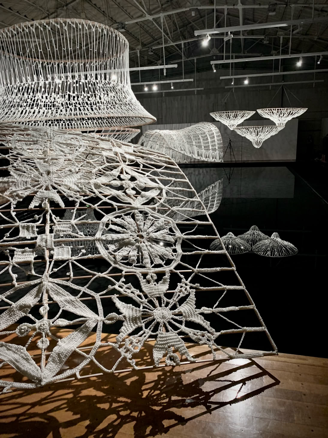 The lace symbolically weaves different people and cultures, while physically, the openings in the surface create patterns of light against dark, a juxtaposition of a permeable surface on different visual layers.