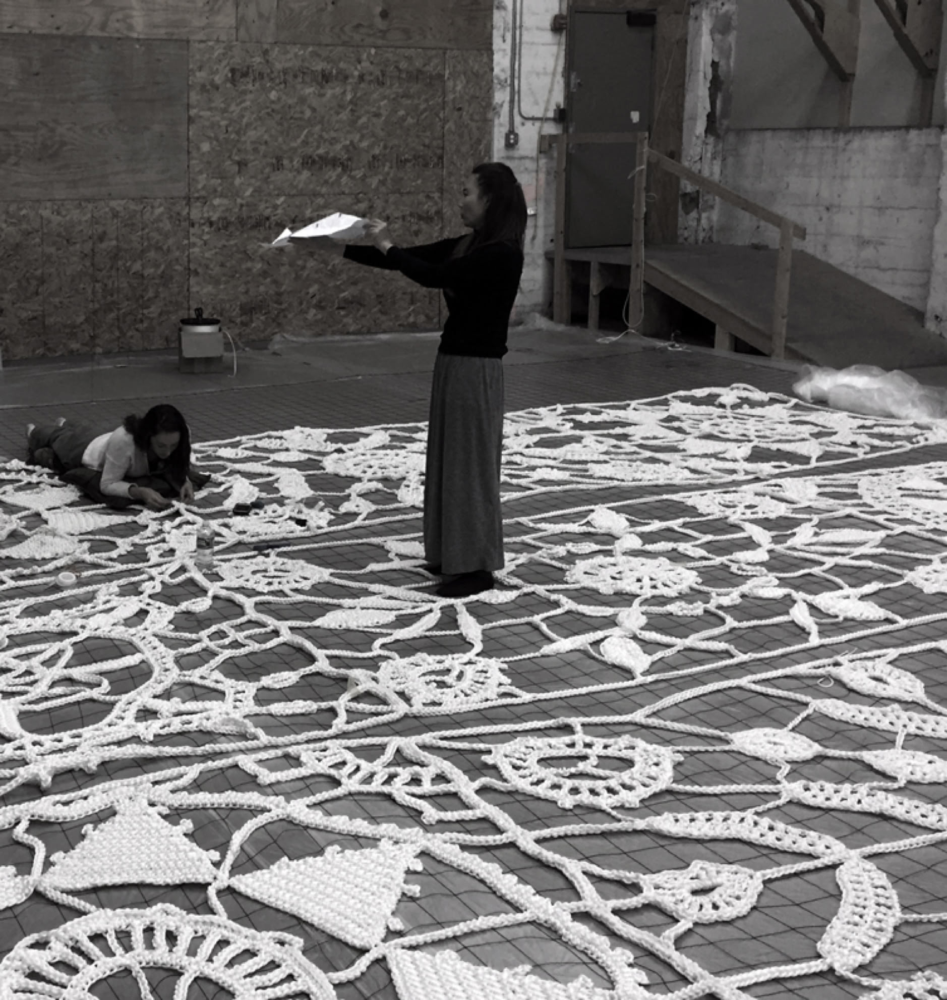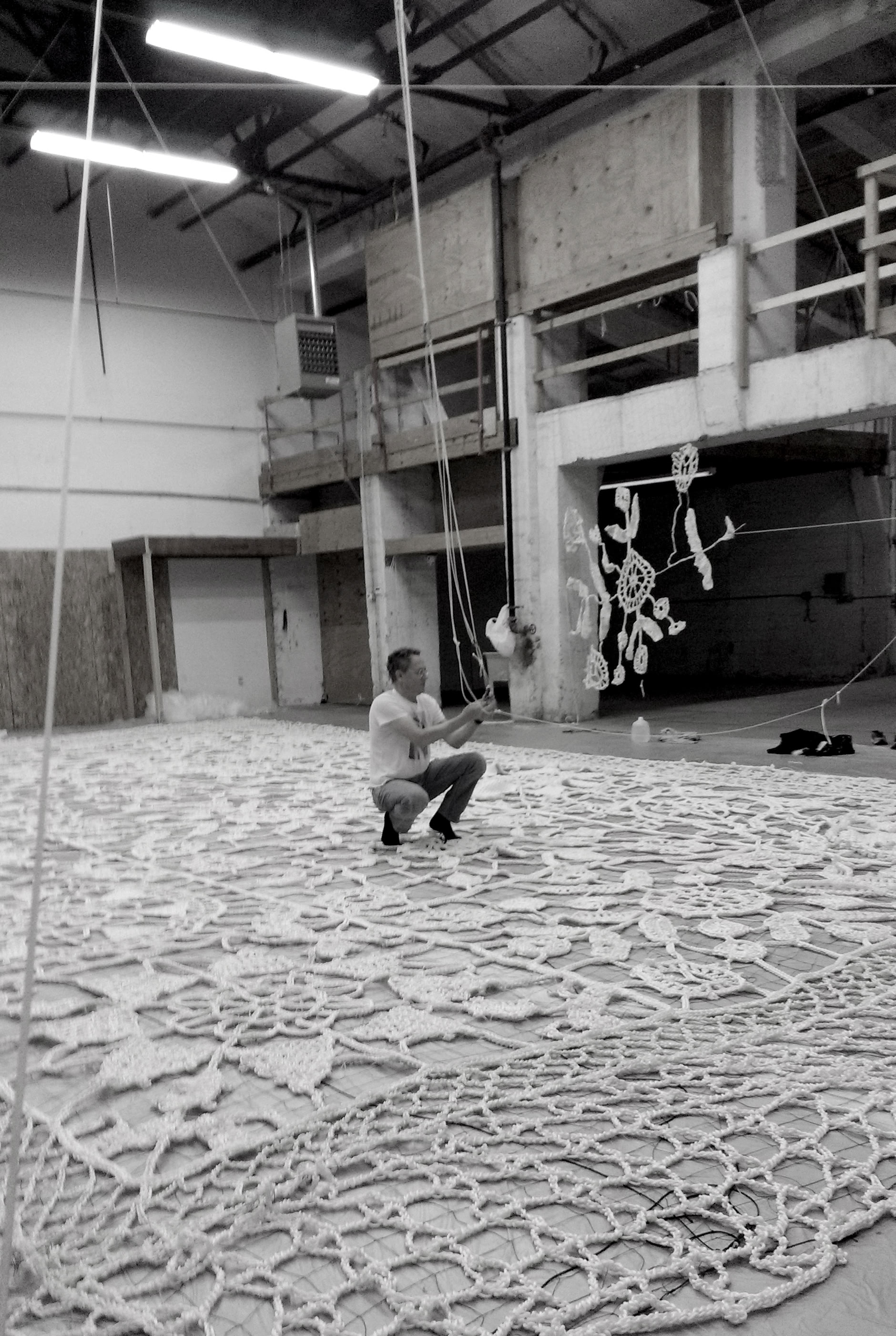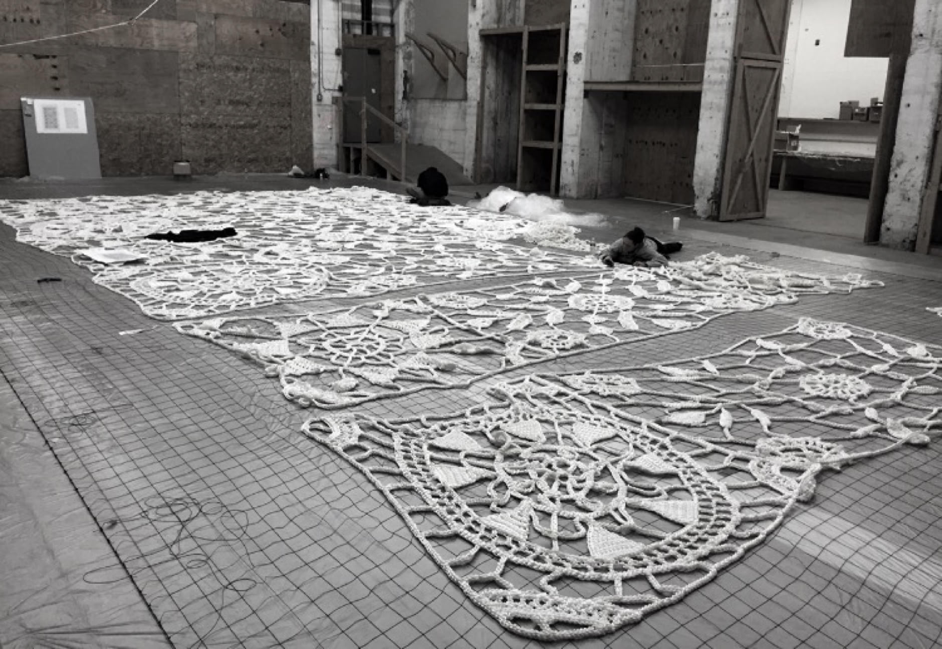 Once she completed a prototype of a motif, she wrote detailed instruction and created a technical pattern. Each of Jin's 6 prototype motifs were to be duplicated twice by other crocheters to make total of 18 motifs. Due to the scale of the project and the weight of the material, crocheters suffered from cracked finger nails and joint pain. Many crocheters gave up and only few could contribute to the project.