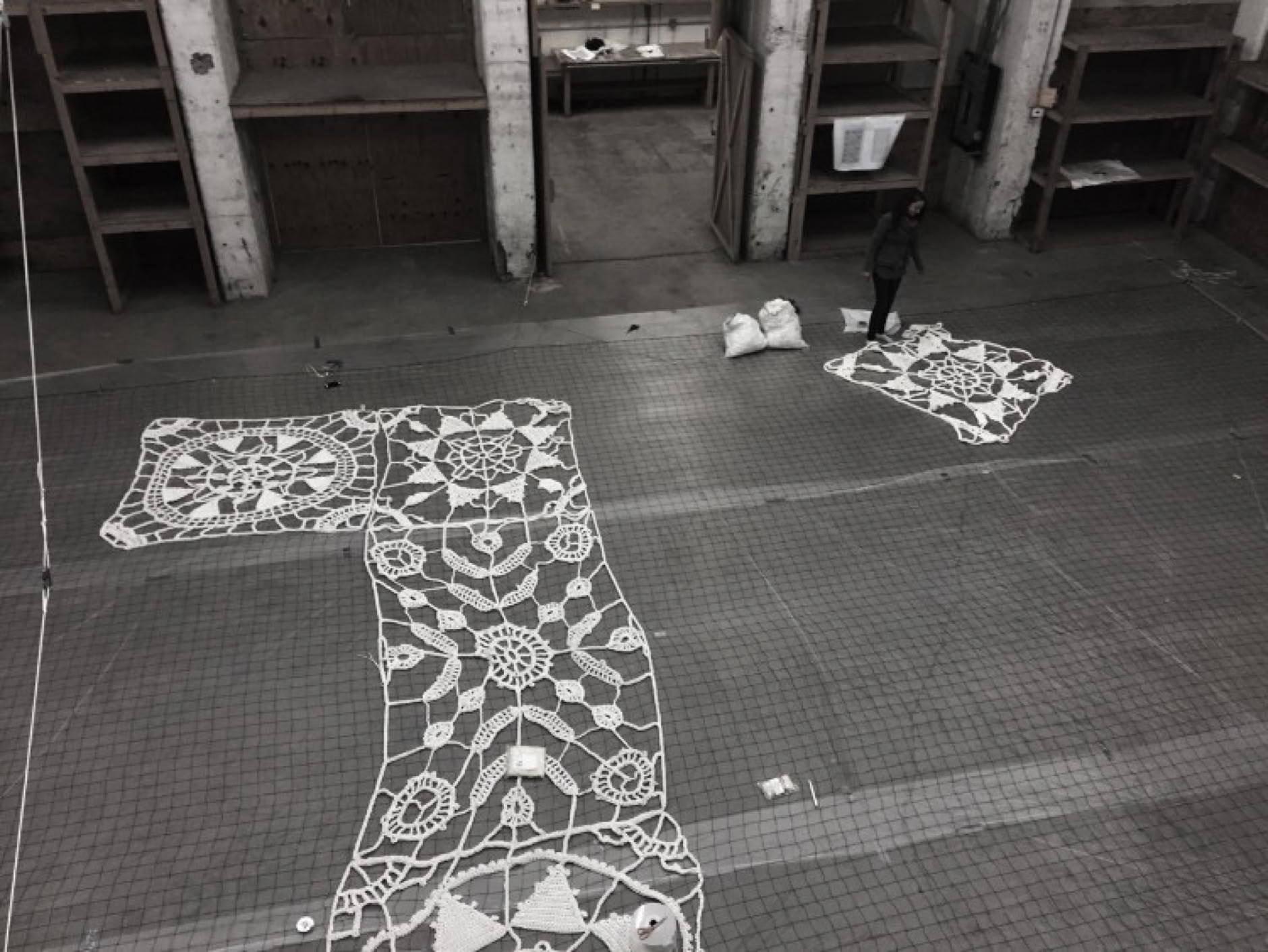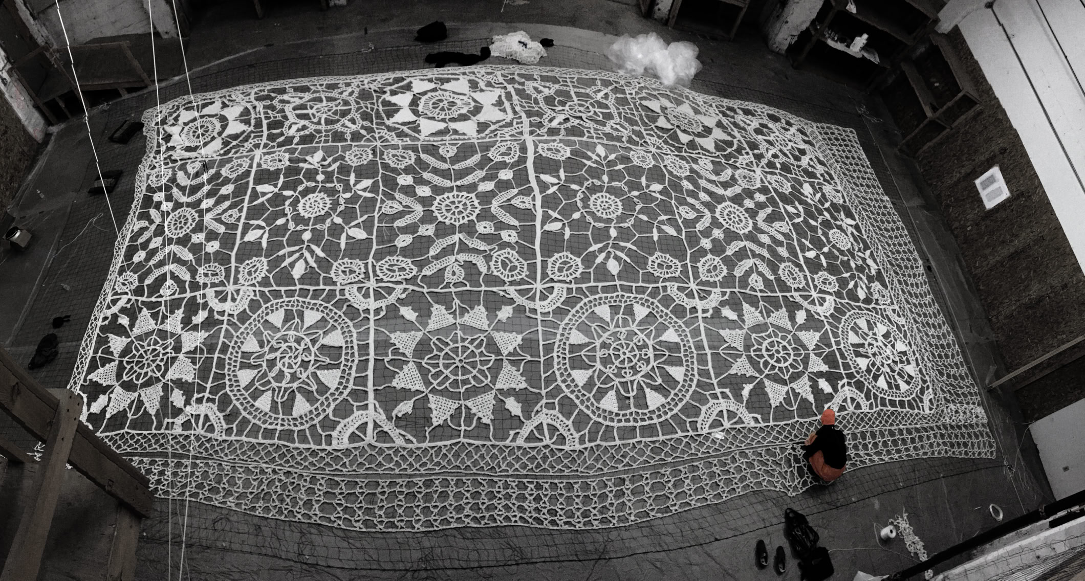For each motif, Jin started with a small study, recreating traditional needle made lace motif in crochet pattern. After her research of the various lace archives, she slowly crocheted big and bigger versions of each motif, adjusting the type and number of stitches and the paths, keeping the original design intact despite the increasing scale and thickness of the yarn. Each motif is hand crocheted and consists of a single, continuous yarn, which is broken only for changing spools or for intentional independent connectors.