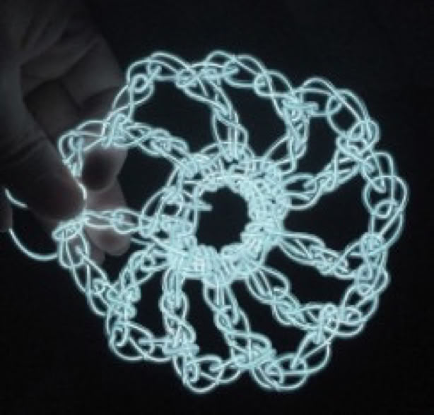 The initial proposal called for electroluminescent wire, which emits light creating a beautiful glow around the Lace. However, the EL wire proved too fragile and too difficult to crochet. The light source within the wire often broke due to the bending of weaving or knitting process. Other optically emissive cords and wires were tested for the Lace, such as fibreoptic cords, but the light source could not travel very far due to the bending and the stiffness of the cord did not allow for the dimensional control which resulted in uneven stitches and irregular patterns.