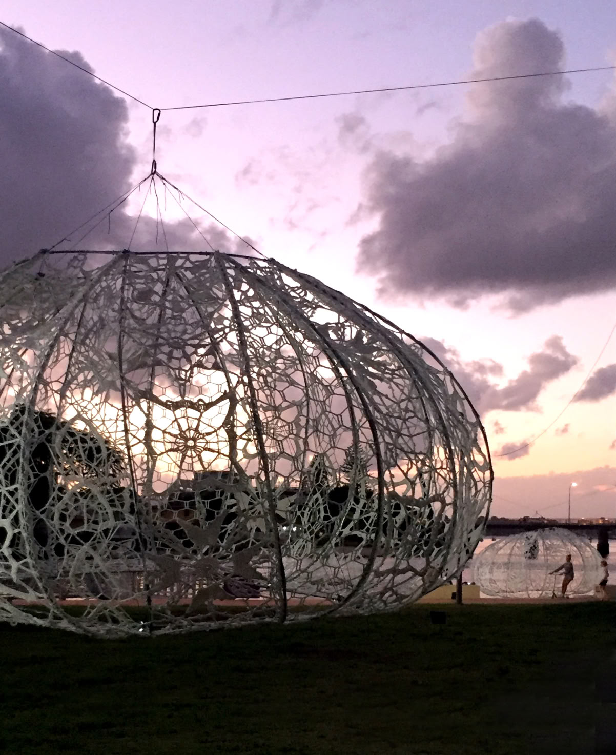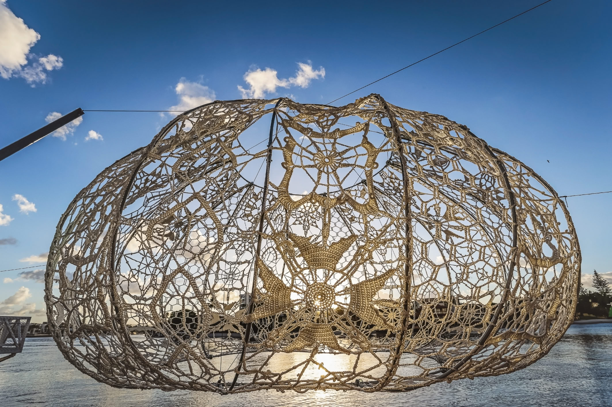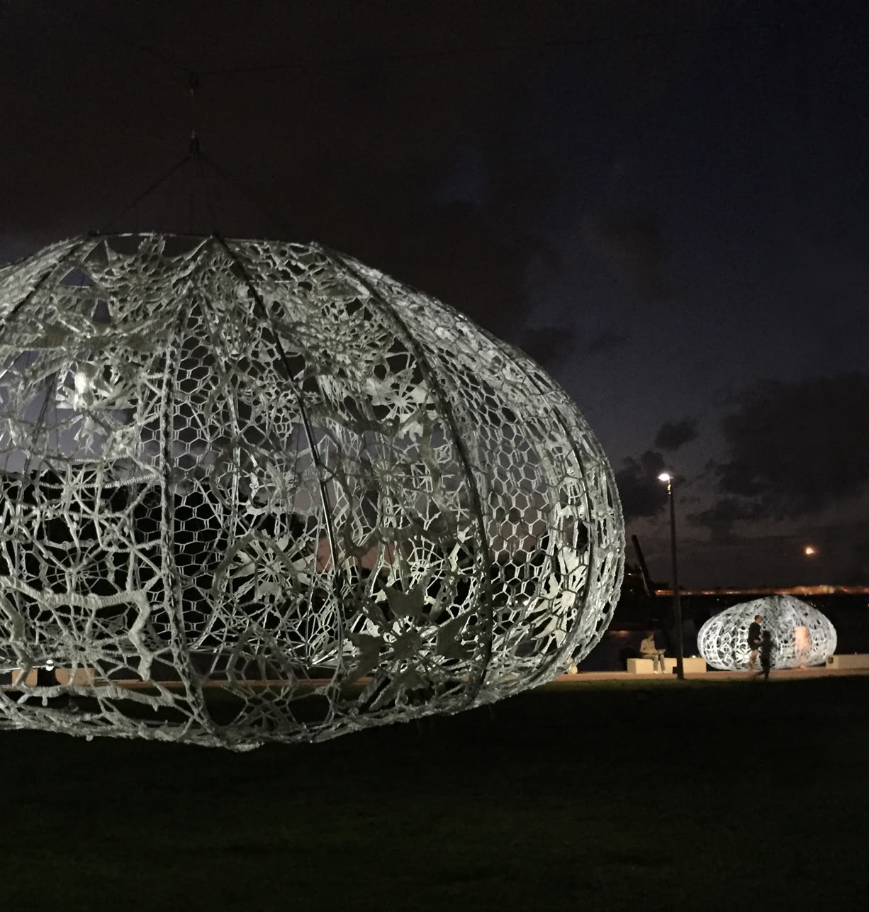 Although they are composed of a firm membrane made from strong marine grade cord held rigid in metal construction, the Urchins create an illusion of a levitating diaphanous lace, light weight and delicate, softly glowing with gentle movement.
