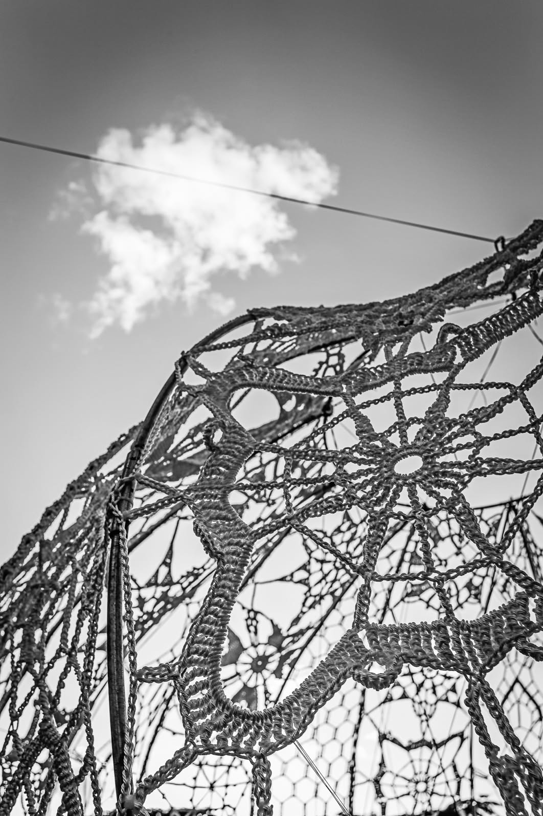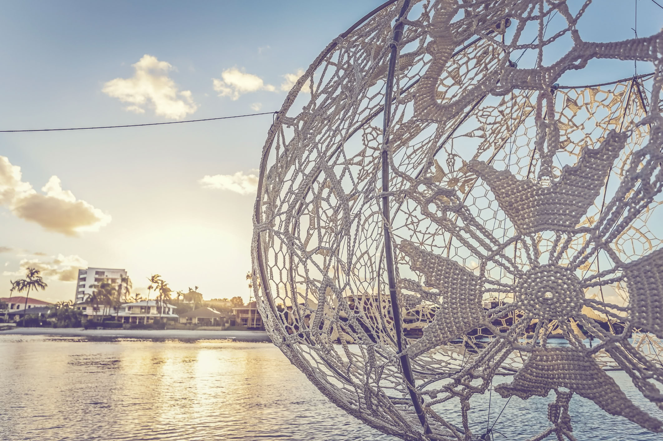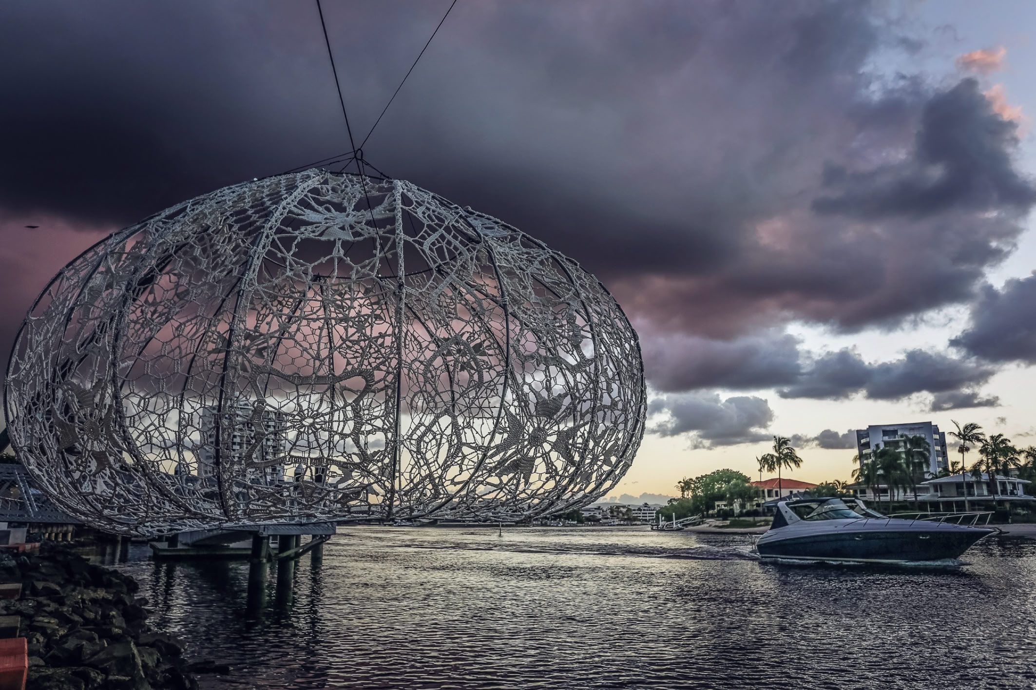 Although they are composed of a firm membrane made from strong marine grade cord held rigid in metal construction, the Urchins create an illusion of a levitating diaphanous lace, light weight and delicate, softly glowing with gentle movement.