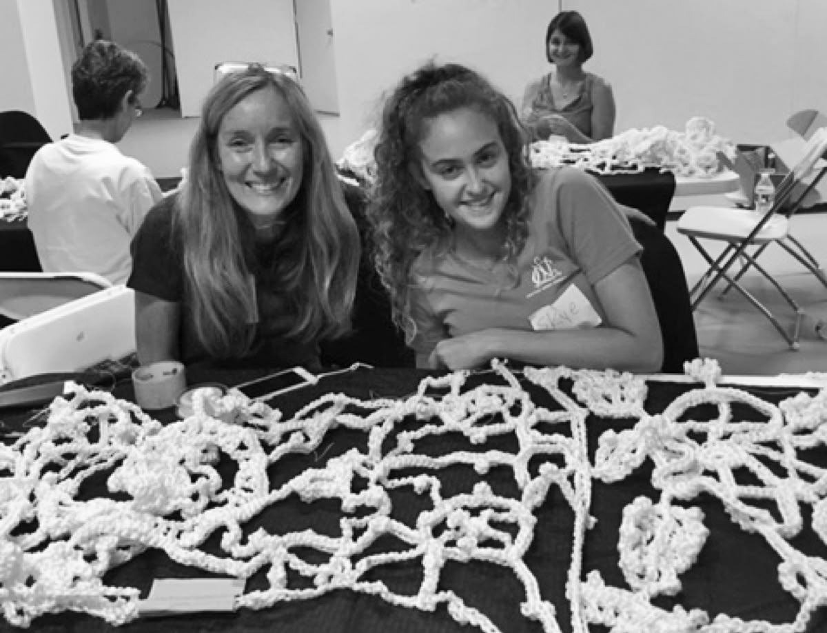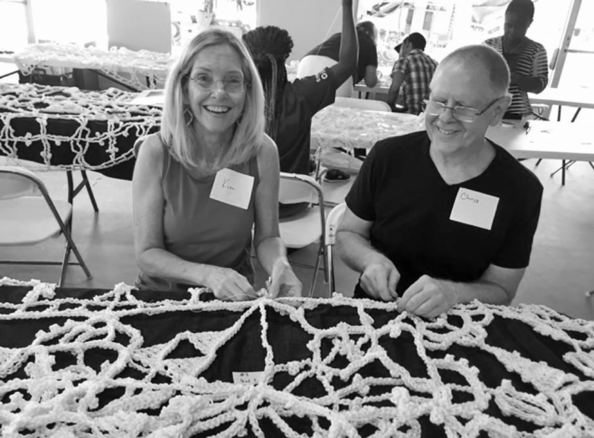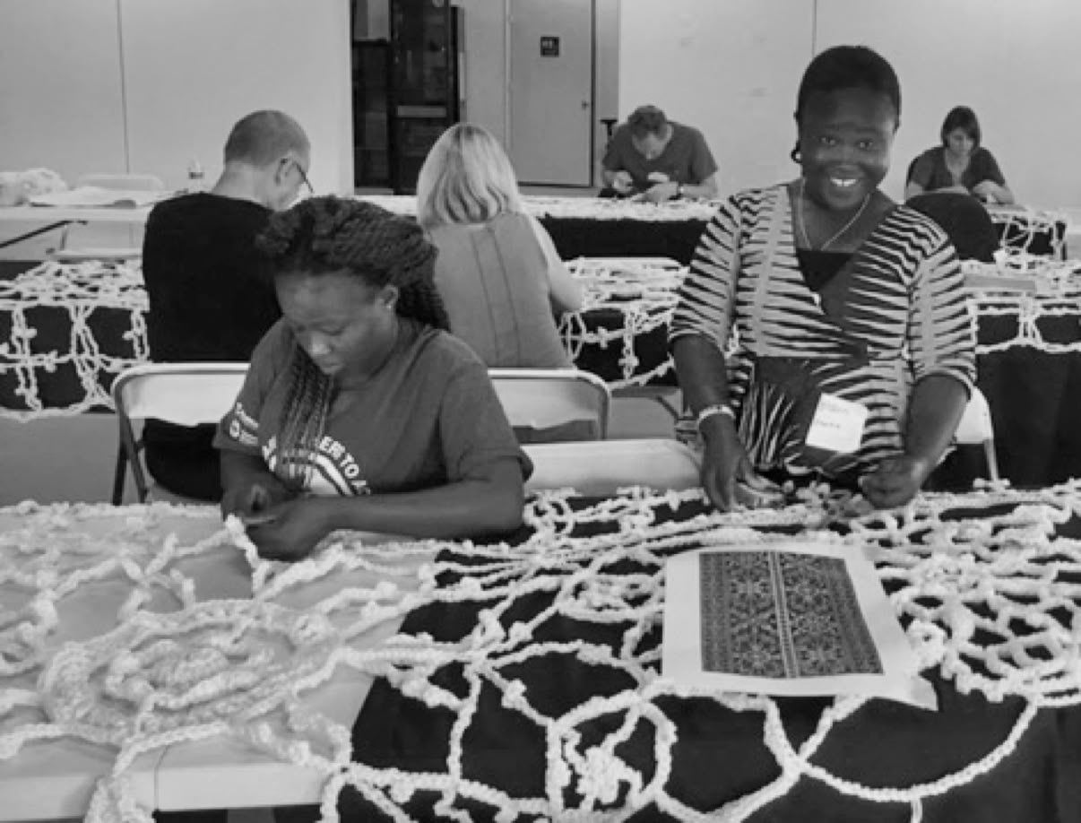 Once all the lace pieces were crocheted, local volunteers in Scottsdale worked together to join the crocheted pieces forming large segments, ready for installation. About 200 volunteers hand sew the pieces together for a month. There were grandmothers, daughter-in-laws and grand daughters who came together to work, husband and wife teams, mothers and daughters, fraternity brothers, foreign exchange students, and brothers and sisters all came together. Strangers became friends and old friends were reconnected through the project.