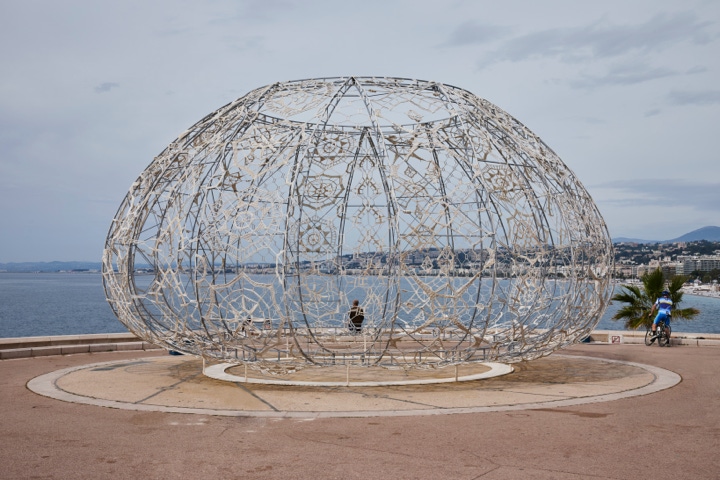 Le jour, la sculpture permet de contempler le paysage à travers ses motifs. La nuit, elle se transforme en lanterne magique, évoquant les créatures bioluminescentes qui peuplent les océans.