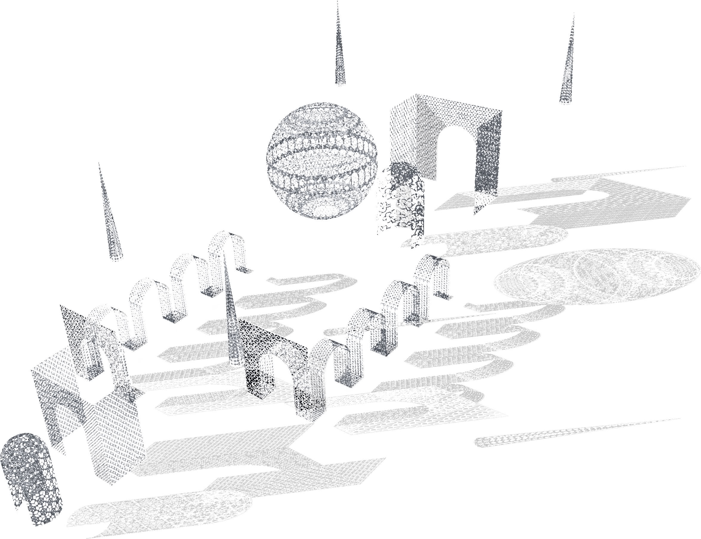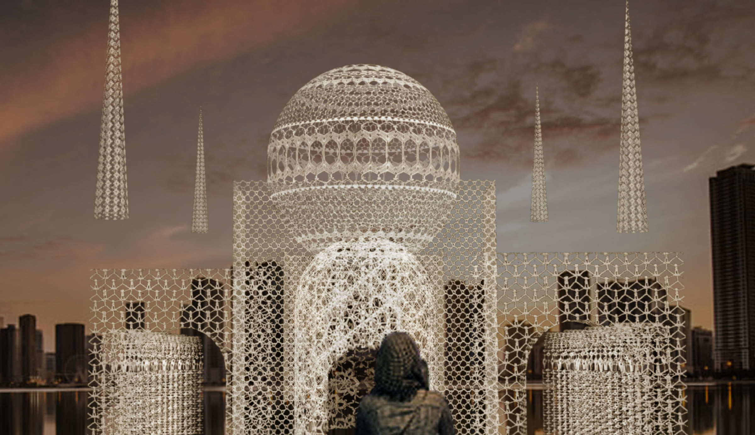 The geometric forms are made entirely from thin cord crocheted, an inherently a repetitive and mathematical method of creating a surface. The collection of forms appear floating, undisturbed by each other, allowing visitors to meander between and through each form, occupy the volumes and touch their surfaces, exploring and interacting with the detailed hand work. When a viewer aligns with the central axial arrangement of these forms, the collective composition transforms, becoming legible as a unified whole, a floating mosque.