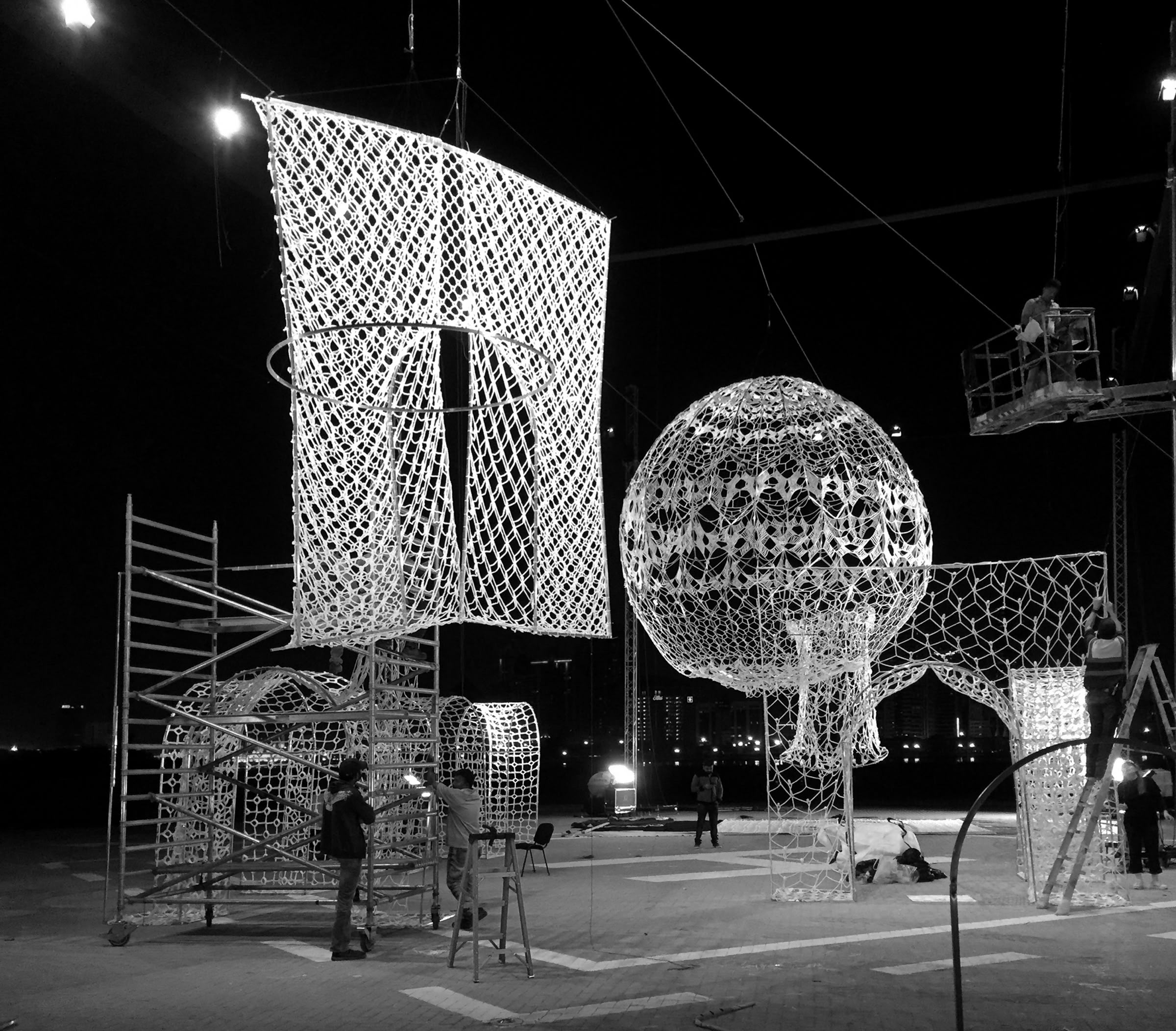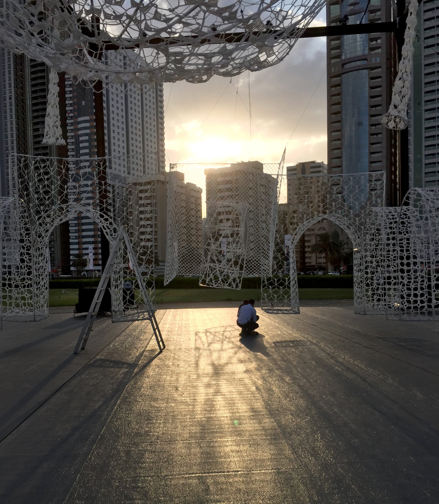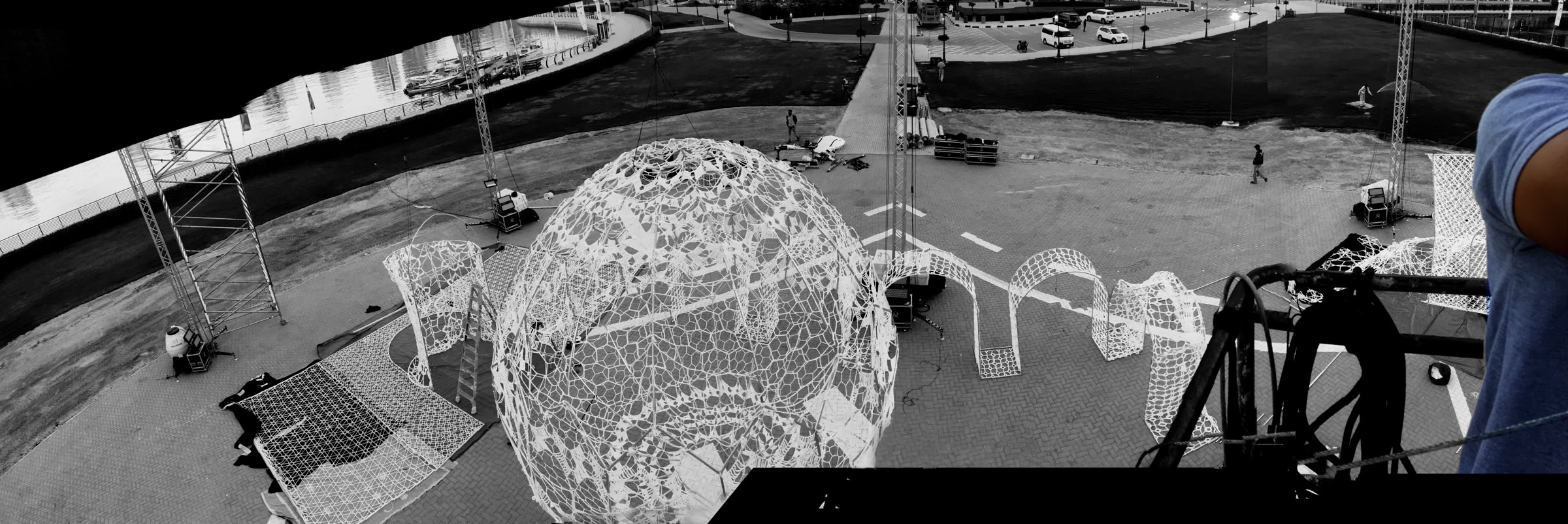 The site, the Al Majaz Amphitheater, is on an artificial island in Sharjah. The support truss structure was installed on the helipad on the island for suspension of the artwork.