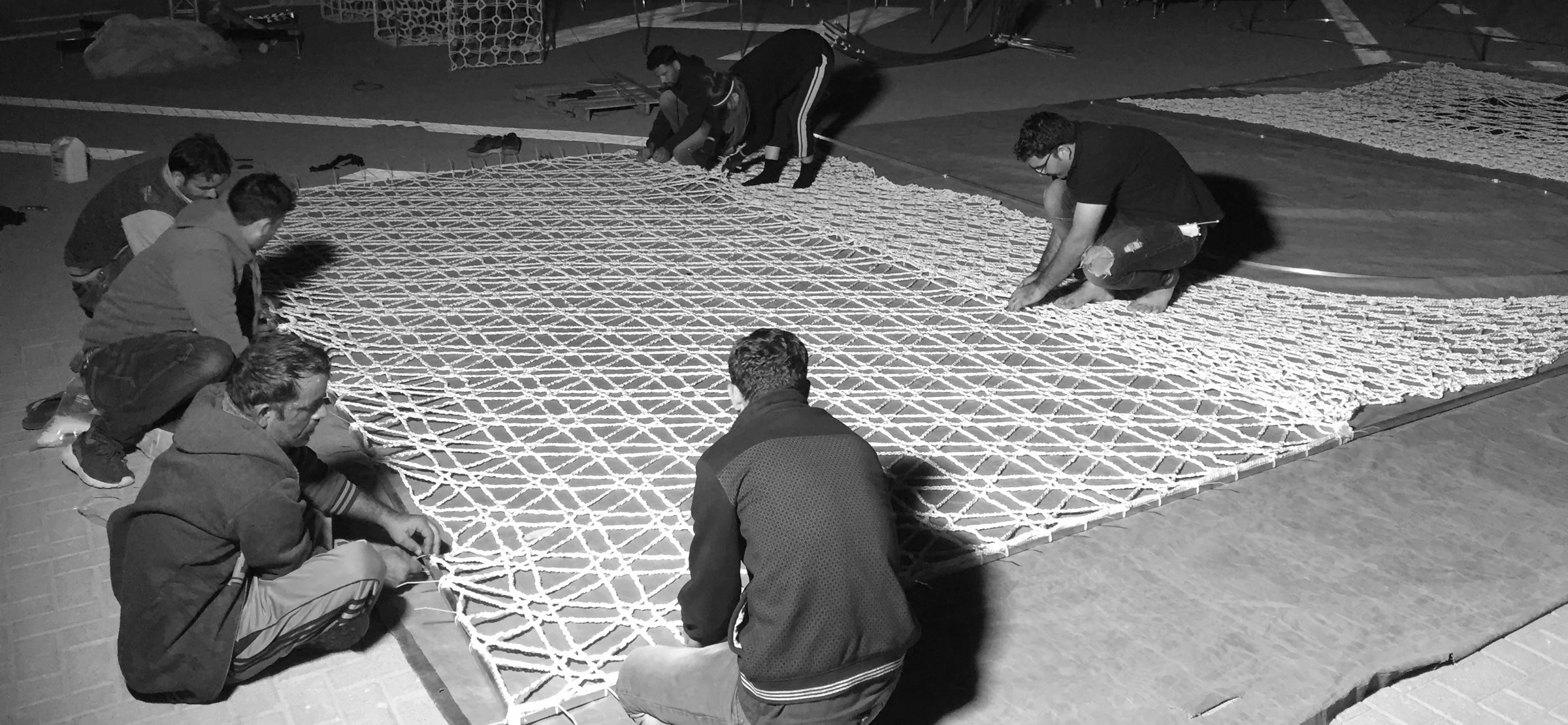 The Flying Mosque forms consist of hand crocheted fabric panels, each fastened to lightweight preformed structure to create the geometrical volumes.