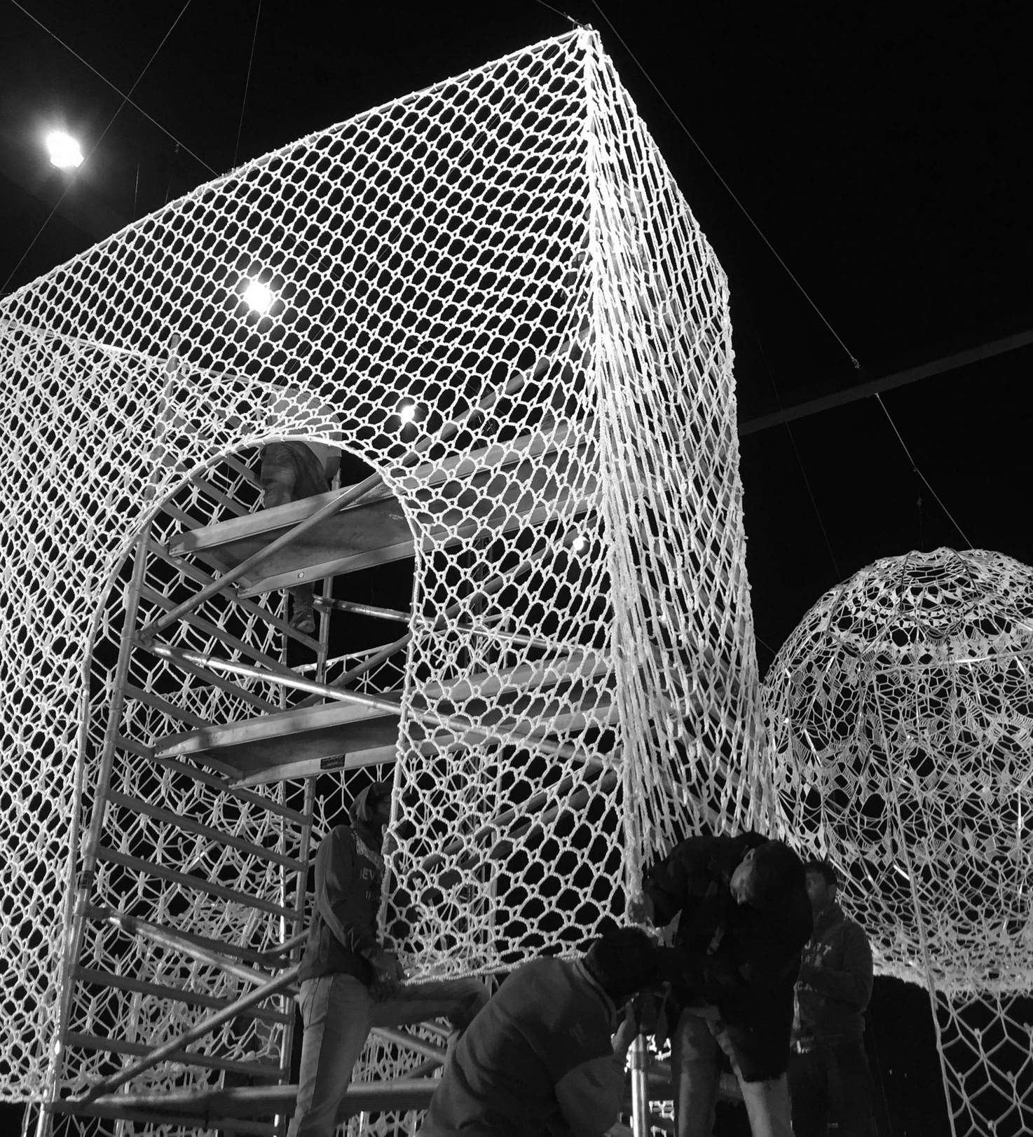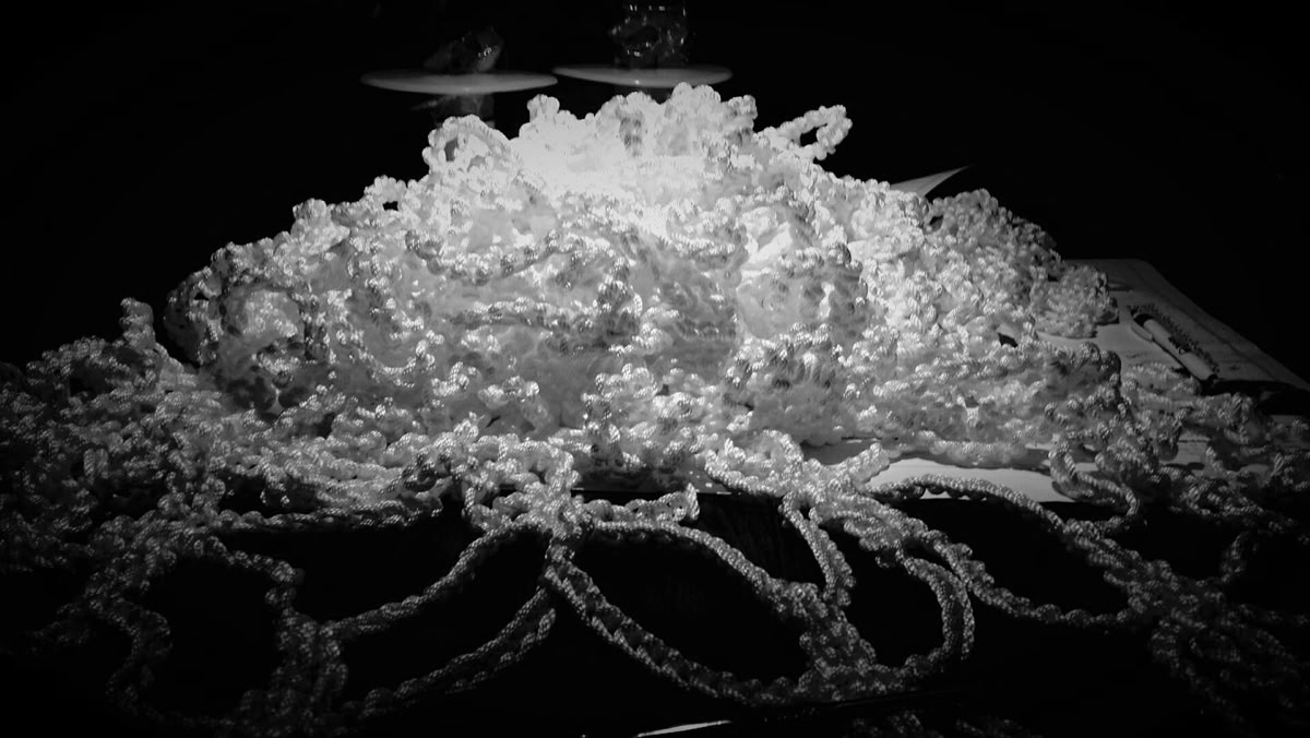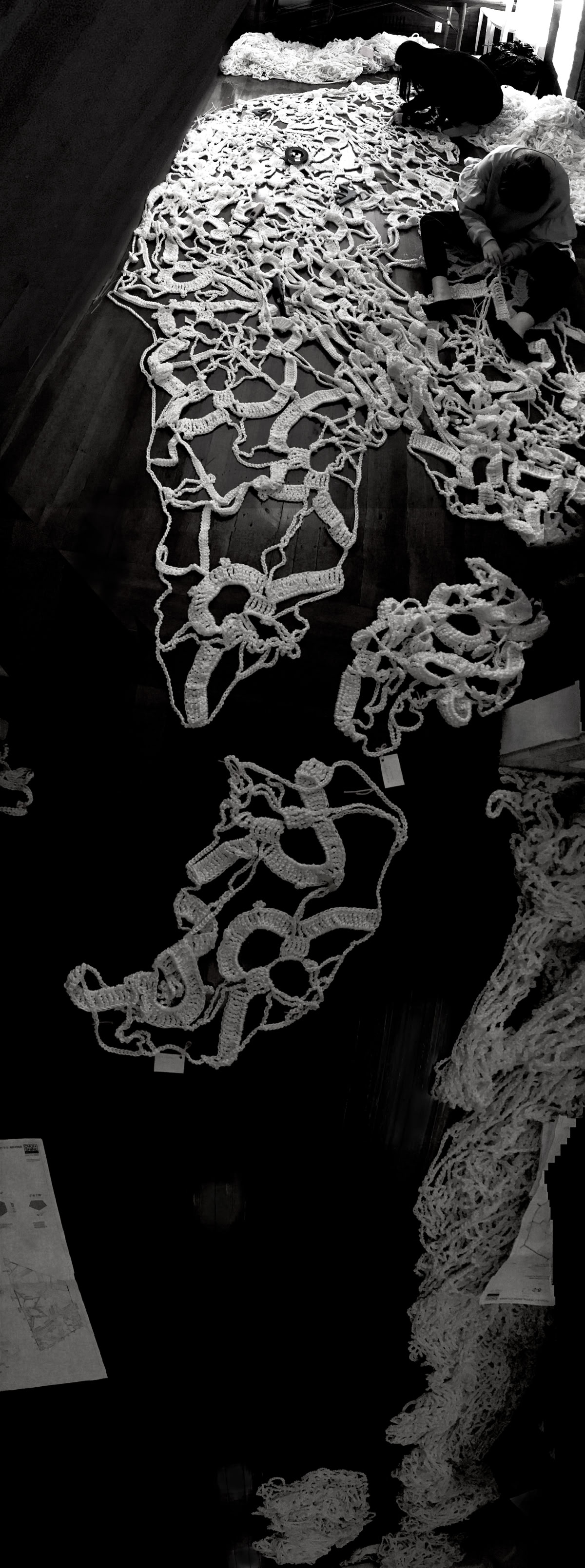 Once the completed work from each volunteer was shipped to our studio in Boston, where the assembly work started. Hand stitching the lace pieces with Dyneema thread was a physically challenging work due to the size of crochet lace, while connecting hand crochet works from many different authors became a tricky puzzle.