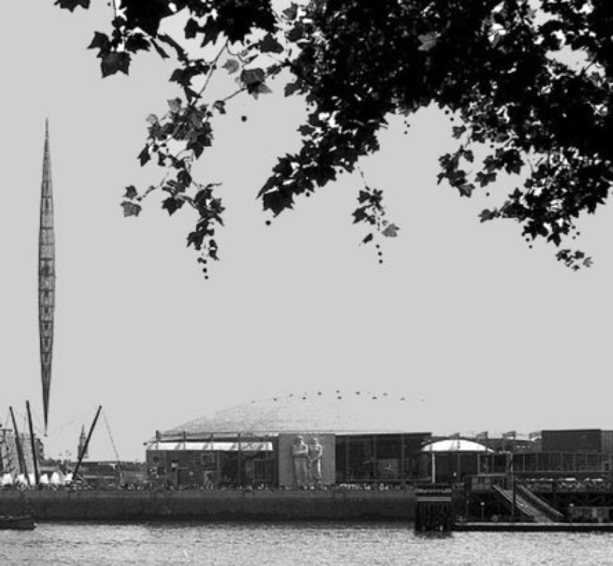 A view of the South Bank Exhibition from the north bank of the Thames, showing the Skylon and the Dome of Discovery.