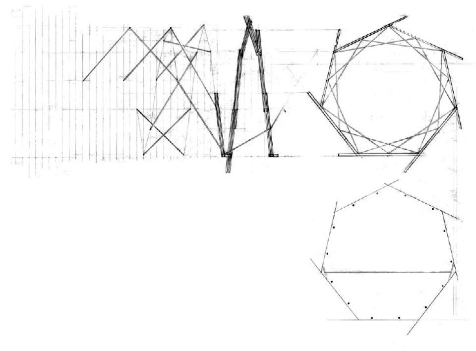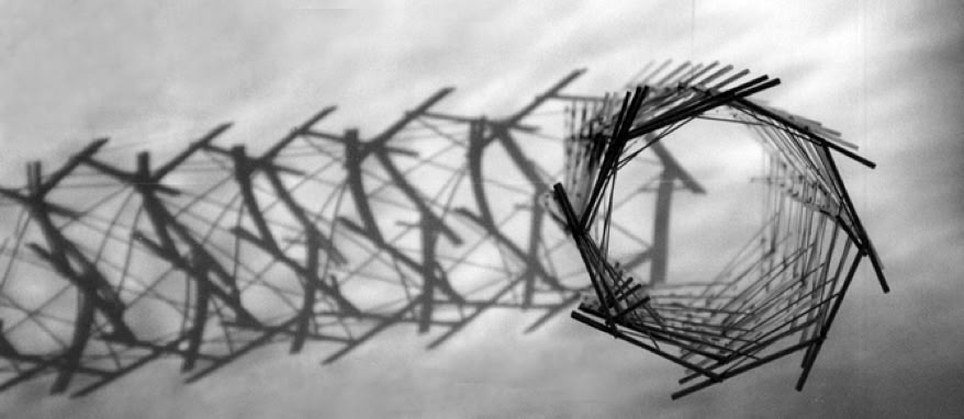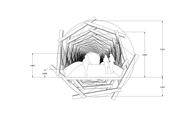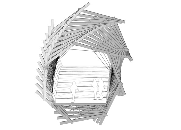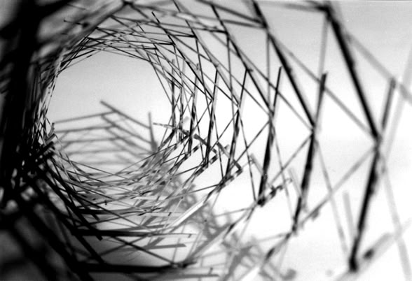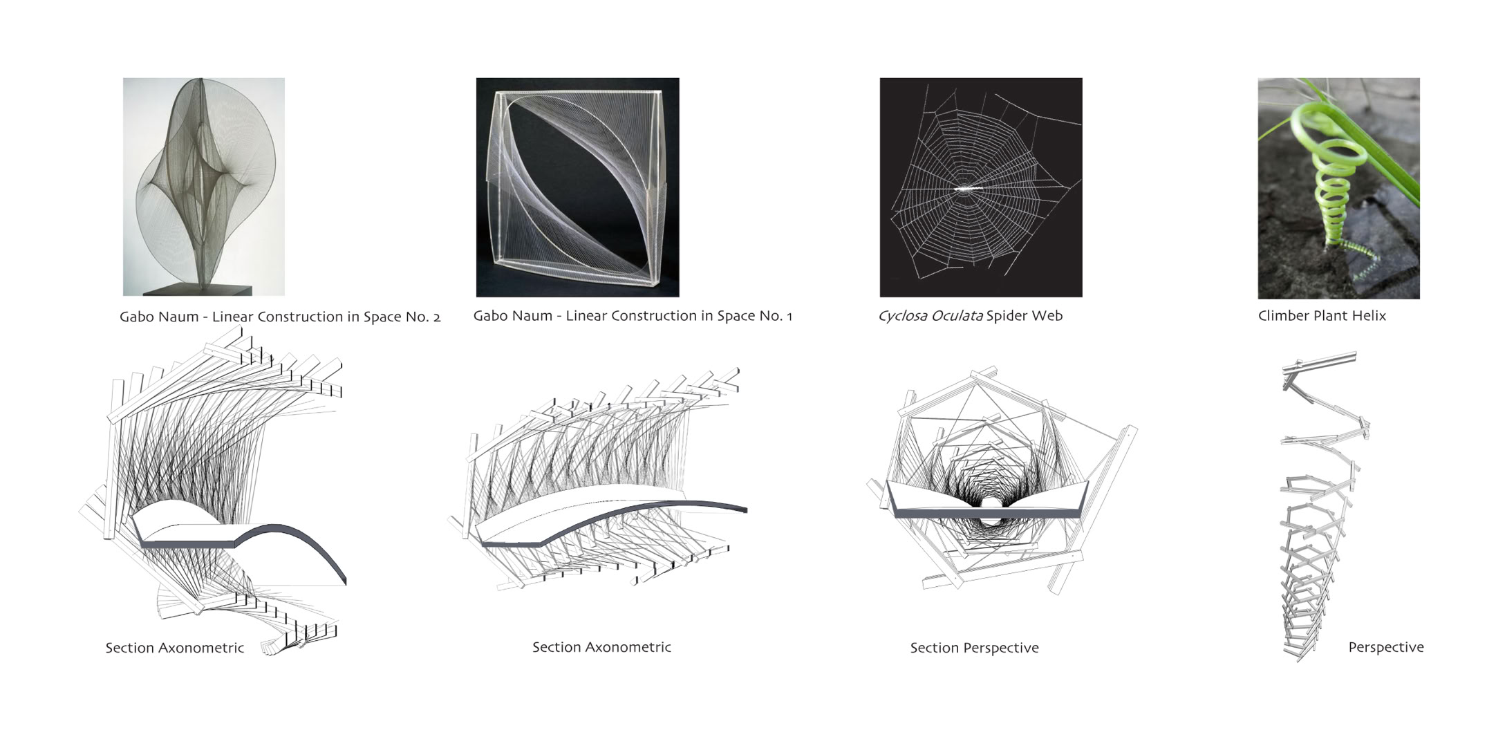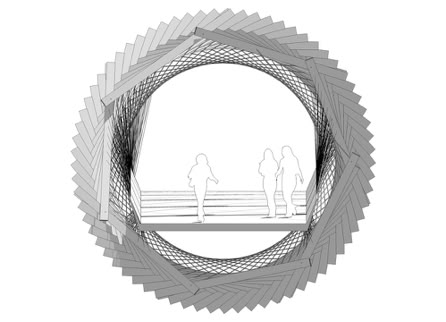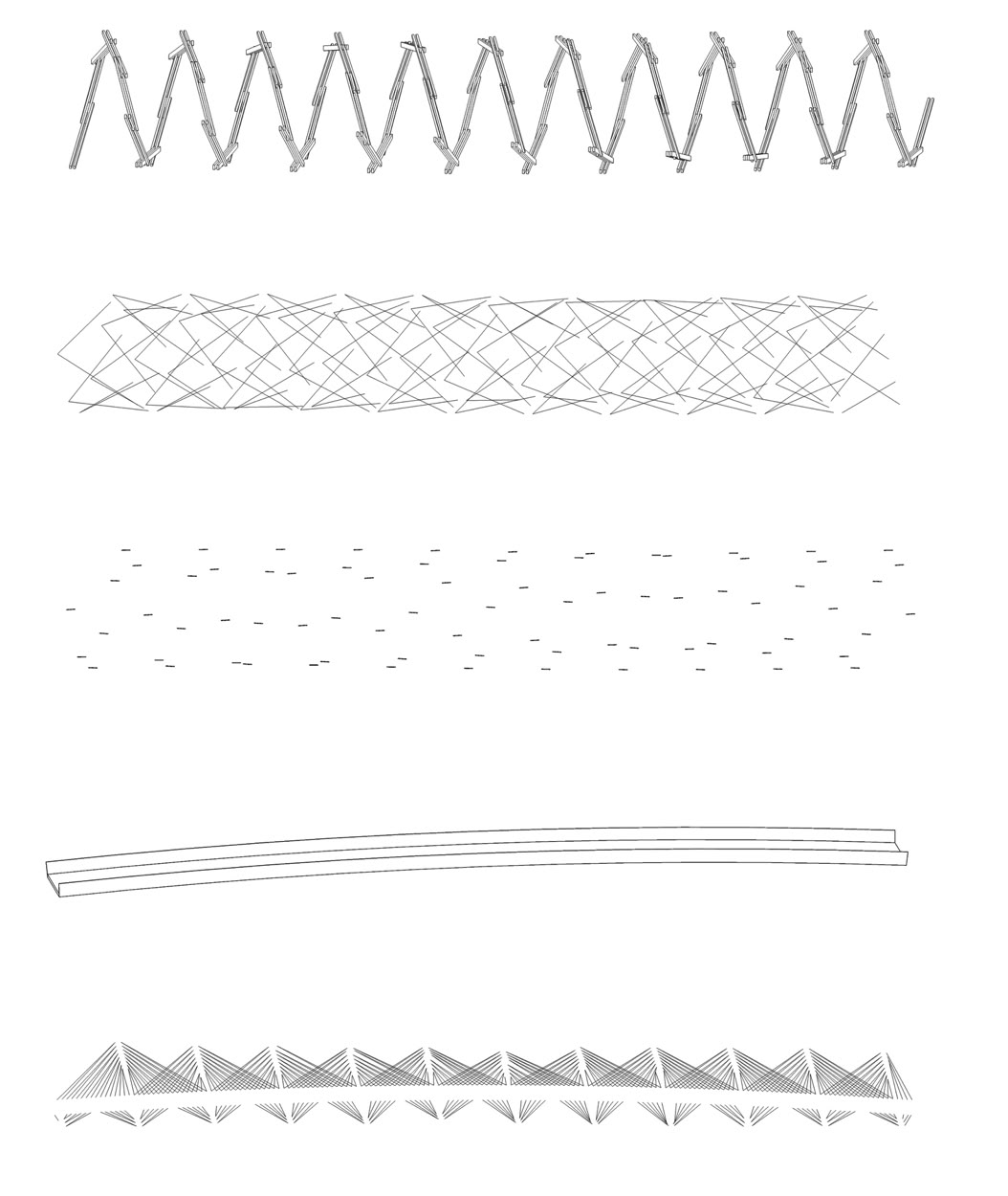 This bridge creates visual rhythm through the users’ movement by using repeated elements in slightly varying positions with hierarchy. The bridge's primary structural elements are two identical box beam fastened to two steel ties. This group of four elements is repeatedly stepped and rotated in a helical pattern, completing just slightly more than on full turn per seven segments, resulting in a rigid structure that is simple, inexpensive and beautiful. Inside this helix, the bridge's deck is suspended on each side from the structural beams with a series of secondary cables that creates the required guard rail with a compelling pattern of fanning cables. Each step across the bridge affords a unique view within this varying structure. The views of the bridge are equally rewarding as it simultaneously appears iconic and creates multiple intriguing patterns as moire patterns emerge within its tendrils. This bridge will become a unique and iconic gateway to area and an delightful experience for pedestrians. It will become a part of the vision and memory of the site.