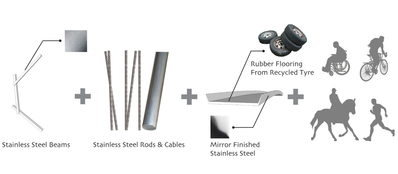 The bridge is a light weight structure, thereby reducing the quantity of materials required for its construction. Stainless steel is used to eliminate the need for paint while recycled tires are used for a resilient deck surface. LED lighting with local solar collectors minimizes the bridges energy consumption.