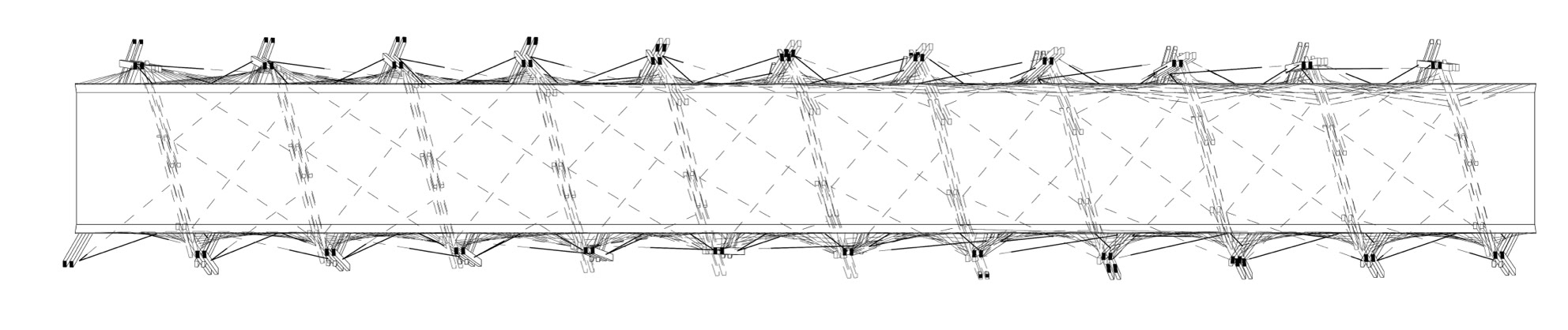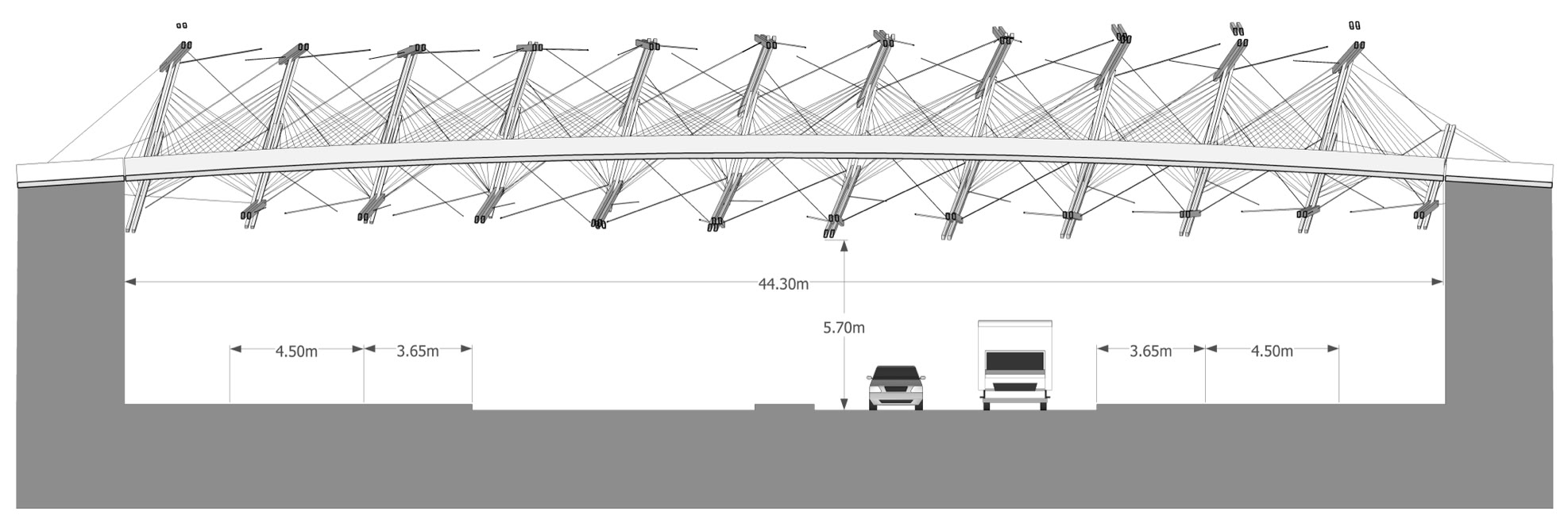 The structural system is unique and highly redundant. The main structural members are paired steel box beams joined by steel ties that effectively create a large diameter rigid cylinder that primarily resists bending moments. The deck resists shear forces and prevents compression between members, while its slight arch assists in transferring loads to the embankments and promotes efficient water runoff. The deck and the structural members are joined though a system of a secondary cables that creates the required guard rail and acoustically separates the deck form the bridge's structure.