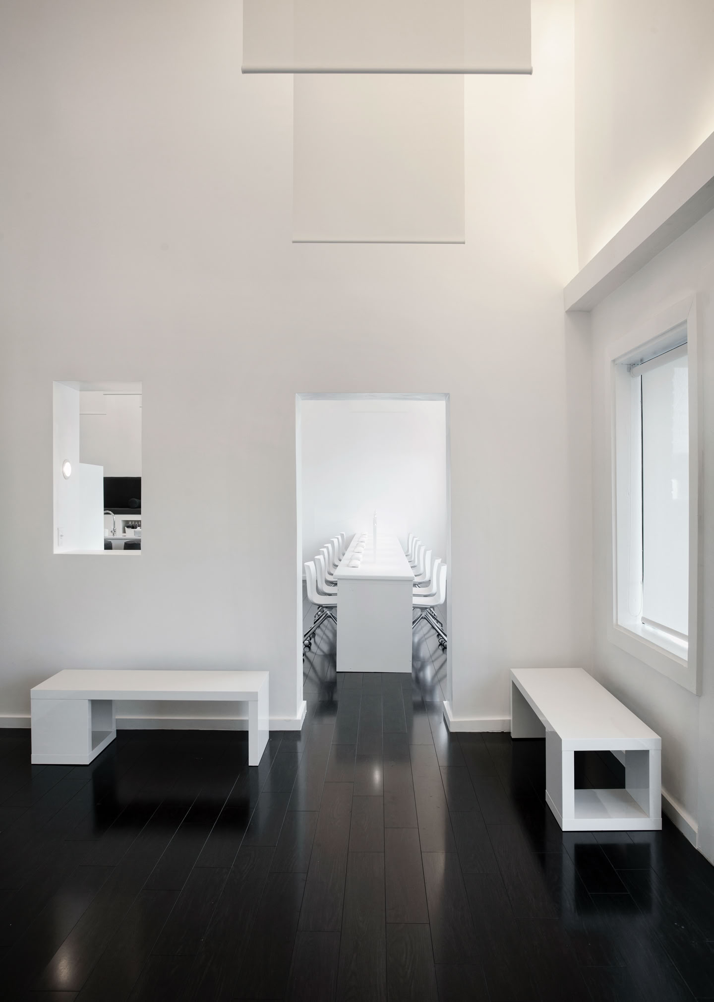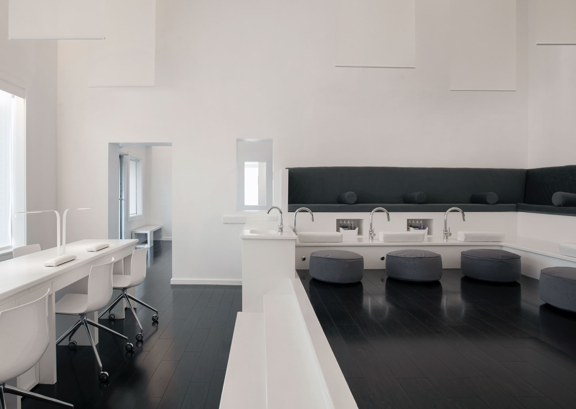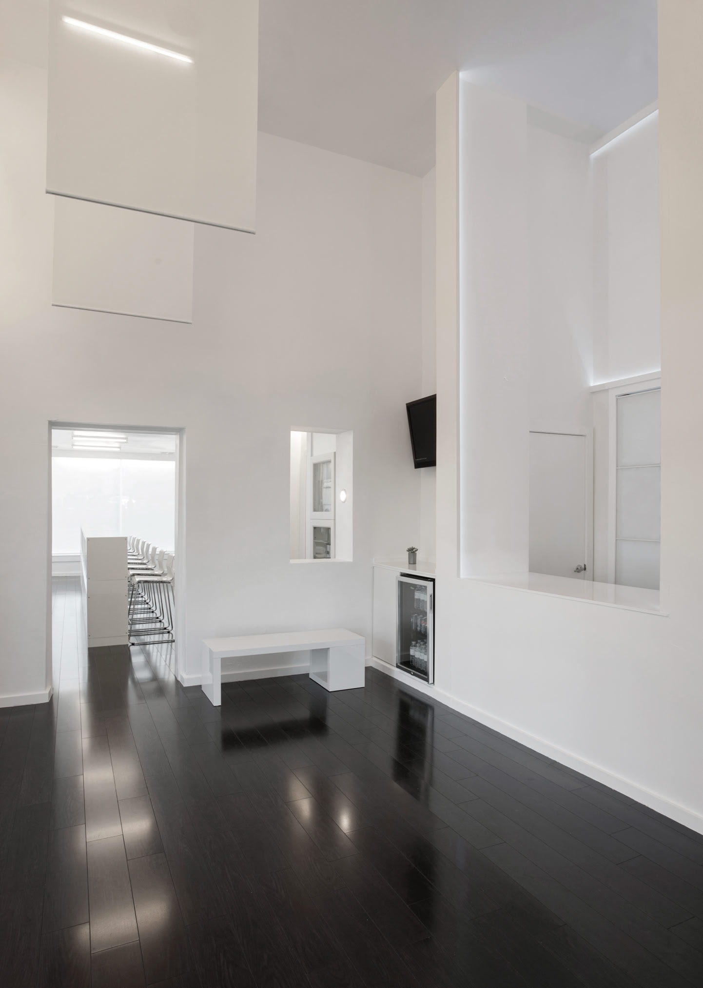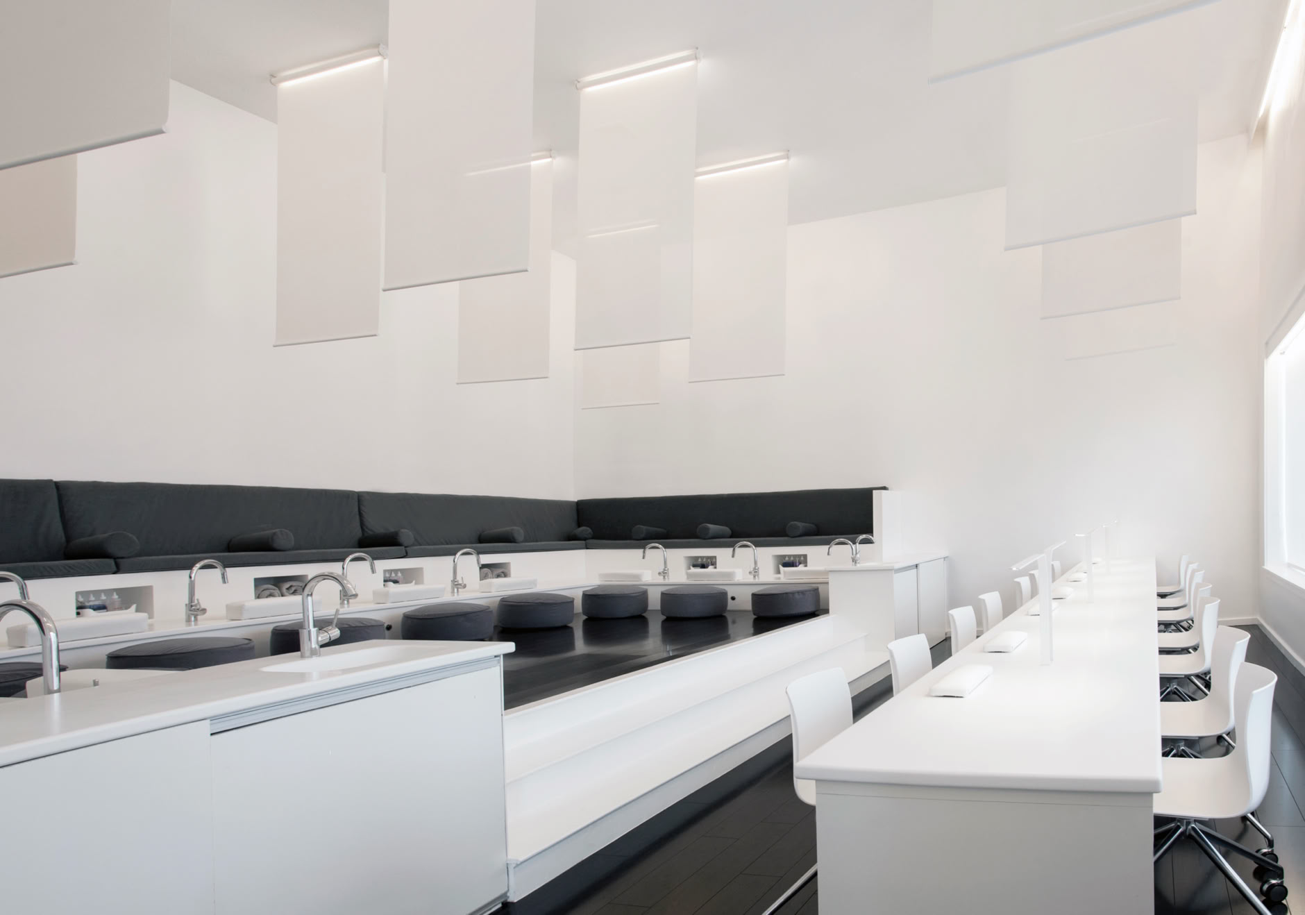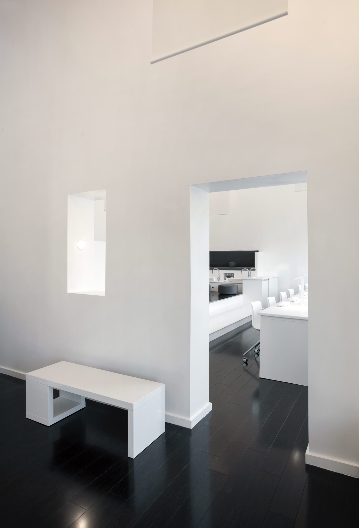 By revealing the double height space above the main spa area, an openness of the space is achieved, promoting the feeling of vertical levitation. Linear lights at the ceiling diffuse along the fabric panels to create the feeling of weightlessness and to attract our eyes vertically, which contributes to the idea of levitation. The overlapping of the ghostly fabric dematerializes and seemingly mystifies the space while the elevated platform further emphasizes this effect, by making occupants ascend to be staged and separated from the rest of the space. In addition, the axial placement of openings creates a visual connection of the three divided rooms and expands the space horizontally, while the similar elements on axis creating an illusion of mirrored images.