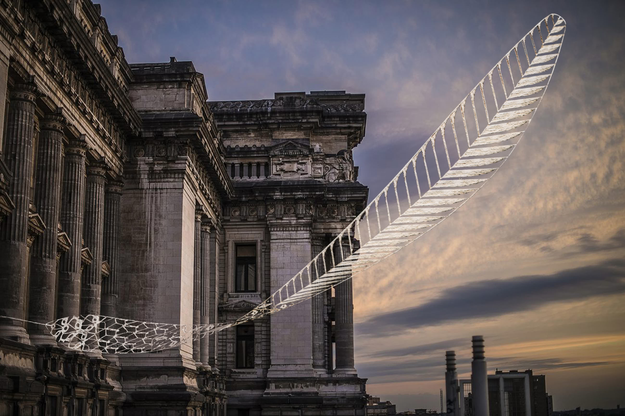 In reference to René Magritte’s iconic ‘Souvenir de Voyage’ or ‘La Nuit de Pise’, the project adds a feather as a physical and symbolic support for one of the most important monuments in Brussels which has been famously unstable for decades. With the feather, it seeks to subvert the laws of physics, evades logic and politics, and questions the viewer’s perception of cultural heritage.
