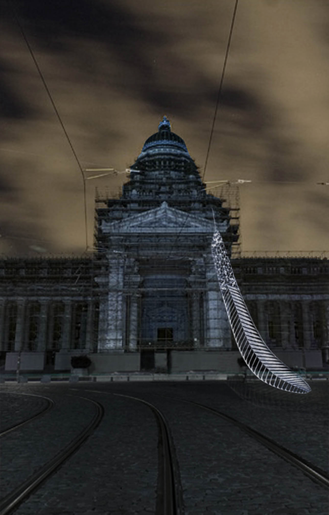 The lace feather in an unusual scale is standing against Palais de Justice in an attempt to support a structure in need of repair. Mysteriously glowing, intricate, feminine and seemingly weightless feather visually contrast the majestic masonry monument wrapped in dark scaffolding.