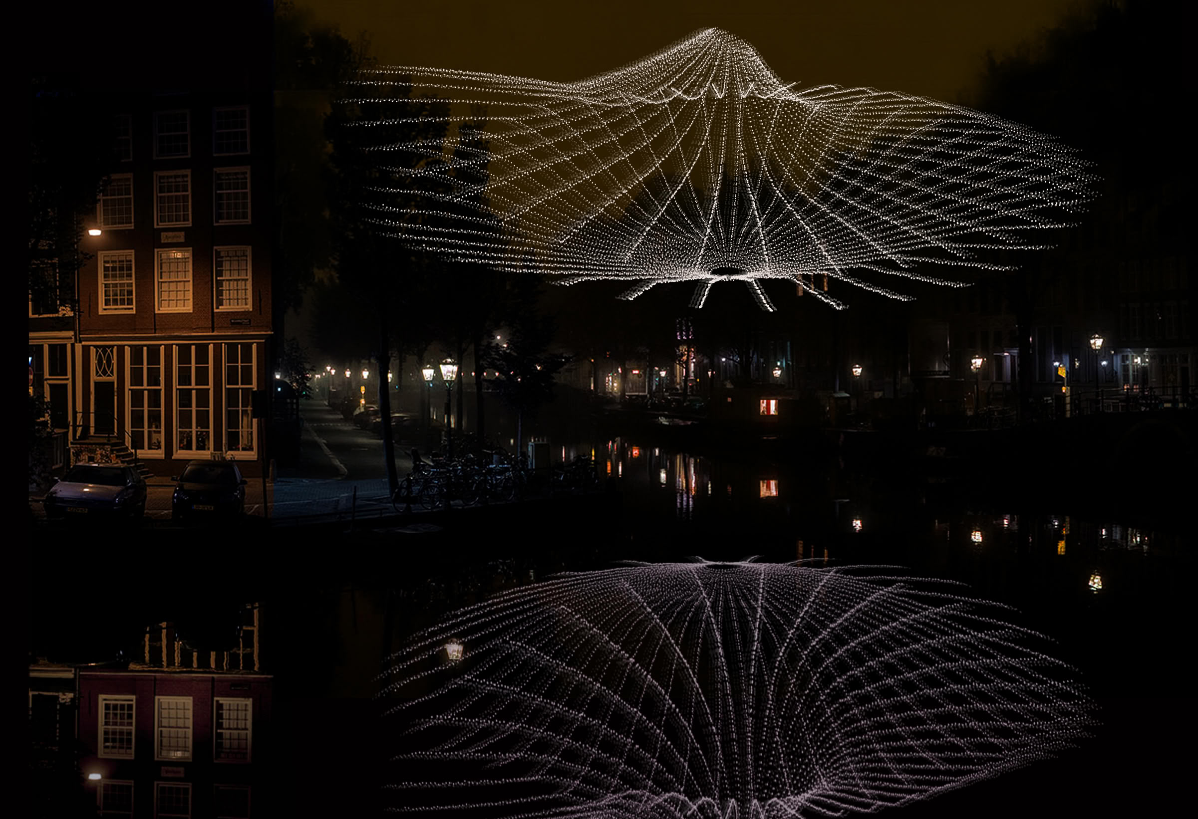 The Line is a series of suspended sculptures over the canal made of multistrand electronic cables and reflective beads. The lifeless industrial object will be awaken by the sound of the everyday in Amsterdam. The Lines slowly starts to rotate then gracefully dance to the Westerkerk bells and the Westertoren carillon.