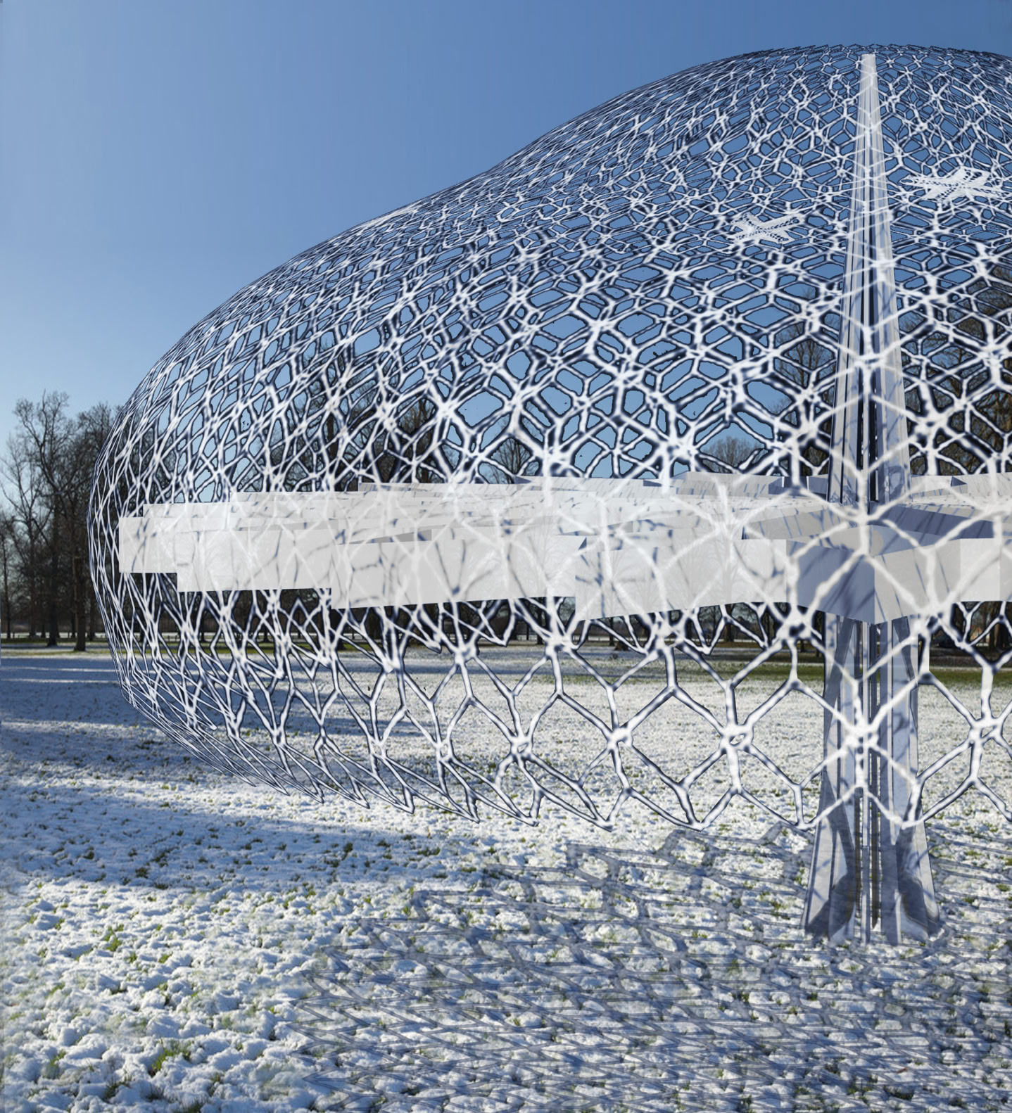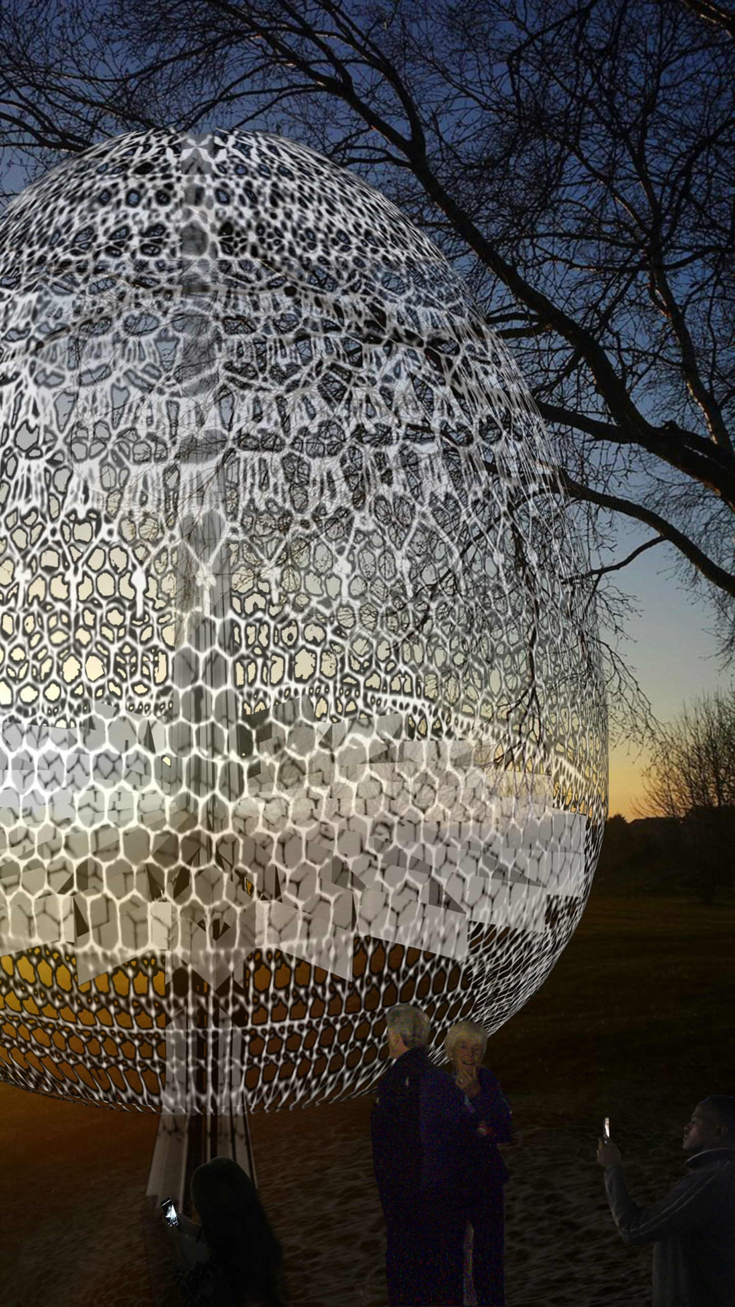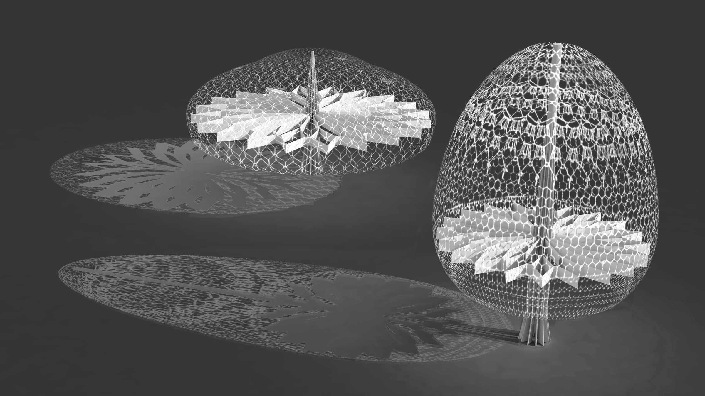 The internal structure also reflects and reinforces the idea of this visual rhythm from mathematical repetition. Juxtaposition of the tree branches, gills of mushrooms and concentric mandala patterns were considered when designing the form of internal support. Together with the mathematical and intricate patterns of the lace, the structure becomes the integral part of the geometric interplay and meditative visual joy.