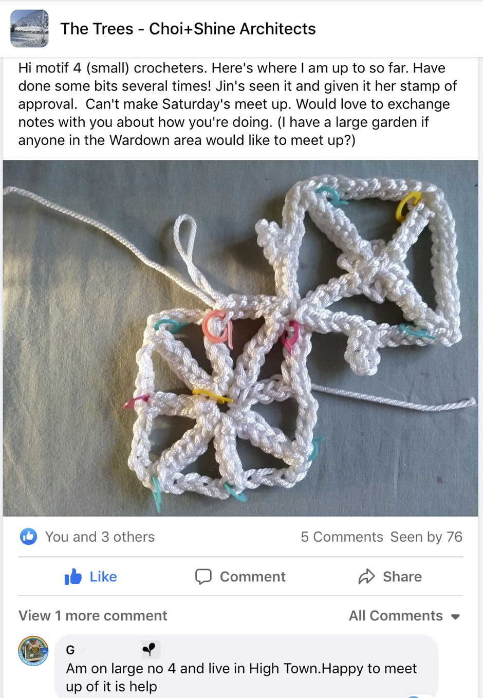 Some great friendships have been set up. Crochet becomes slightly addictive and it is so hard to walk into Hobbycraft and not look at yarn and patterns”.